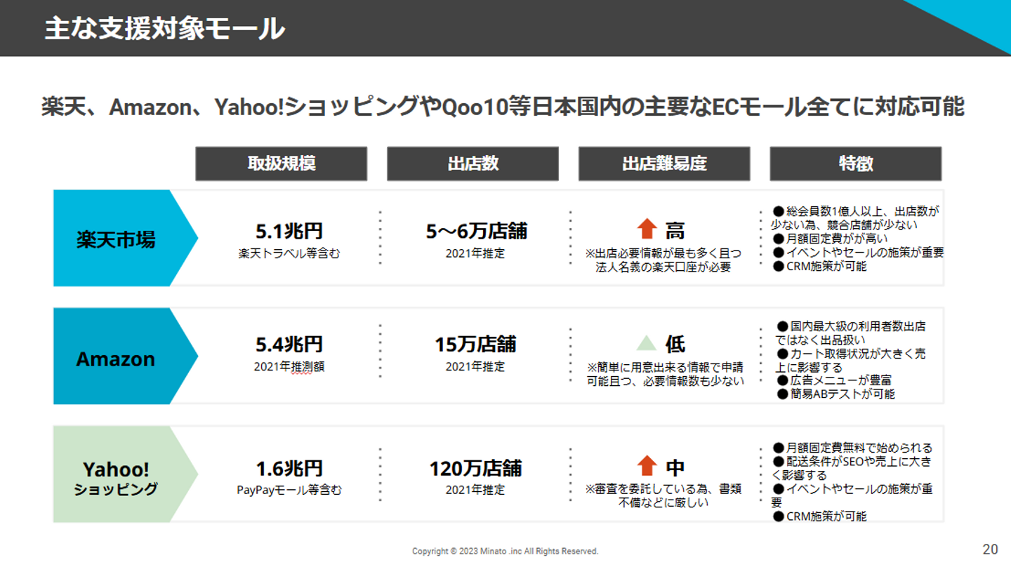 楽天市場、Amazon、Yahoo!ショッピングやQoo10などの日本国内の主要なECモールすべてへ対応しています。各モール毎にユーザー層が異なるため、それぞれのお客様のニーズに合わせてマーケティングの最適化を進め、売上拡大を目指します。