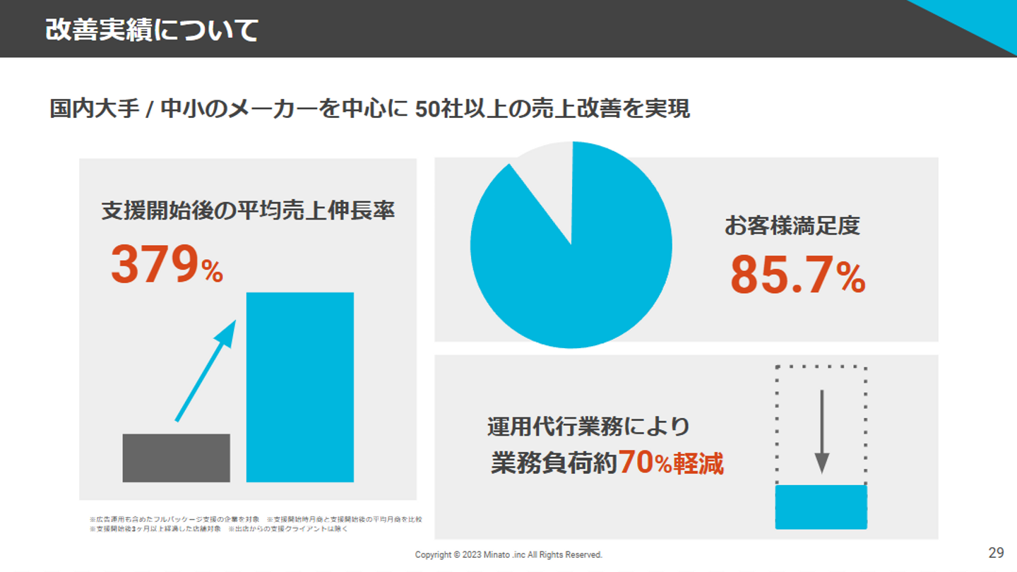 過去に支援させていただいたクライアントへのアンケートによると、満足度は85.7%を記録しています。支援開始後の売上伸長率は平均379%増加しており、4倍近く売上が増加しております。また、運用の代行によって業務負荷の約70%軽減を実現しました。
