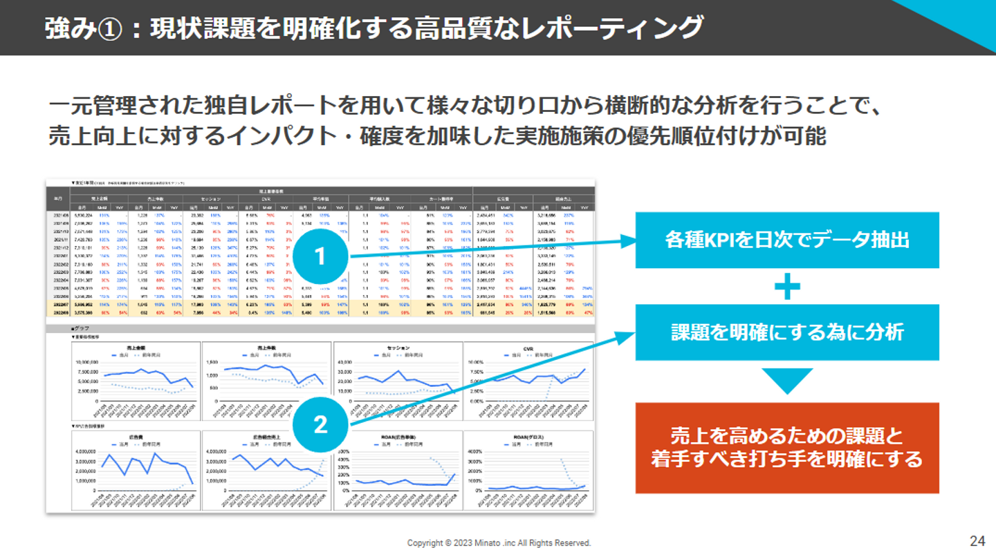 一般的な代理店での広告運用では、広告単体での費用対効果といった短期的な視点になることが多くあります。Minatoでは広告単体の効果だけではなく、広告を用いた検索順位の向上や過去の受注データに基づく広告予算の策定といった中長期的な視点での支援を行っています。