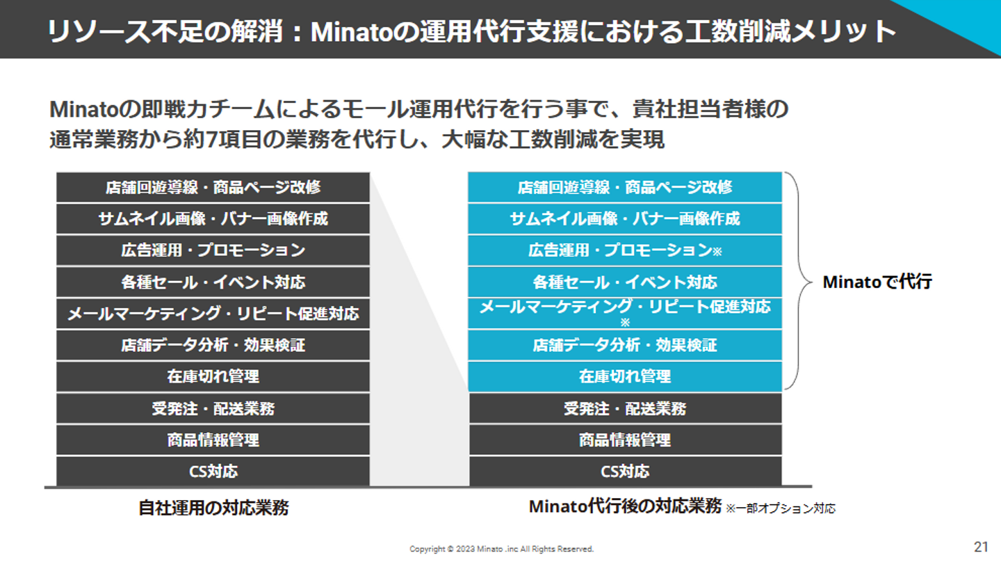 Minatoによる運用代行業務は、「受発注や配送、商品情報管理、カスタマーサポート(CS)以外のすべてのマーケティング領域」に対応しております。