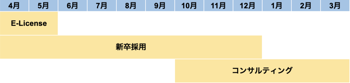 まず、4-5月は”E-License”という弊社オリジナルの新卒研修に取り組みます。そして、同時に新卒採用を行います(新卒採用についてはこちらの記事をご覧ください)。新卒研修が完了した後は、サマーインターンシップのある9月までは新卒研修をメインで担当して、10月から実際にお客様に対してコンサルティングを提供します。