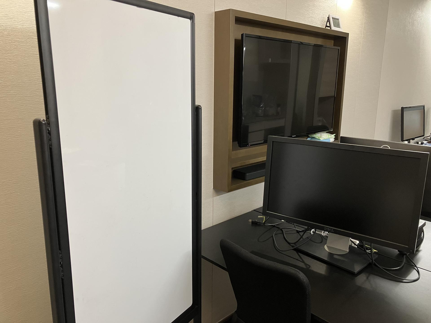 ホワイトボードや大きなモニターもあるのでこれらを利用してミーティングを行うこともあります。