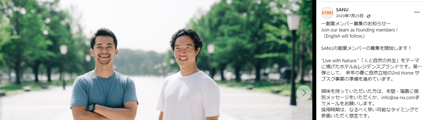 「Live with Nature.を理念とするSanuを創業します」という、東京大学同期の福島 弦(SanuのCEO)の投稿を見た時でした。同期といえど、在学中は会話を交わすような間柄ではなく、一言二言あいさつをした程度。でもその投稿を見たとき、自然と私の手は福島へのメッセージを打ち始めていました。