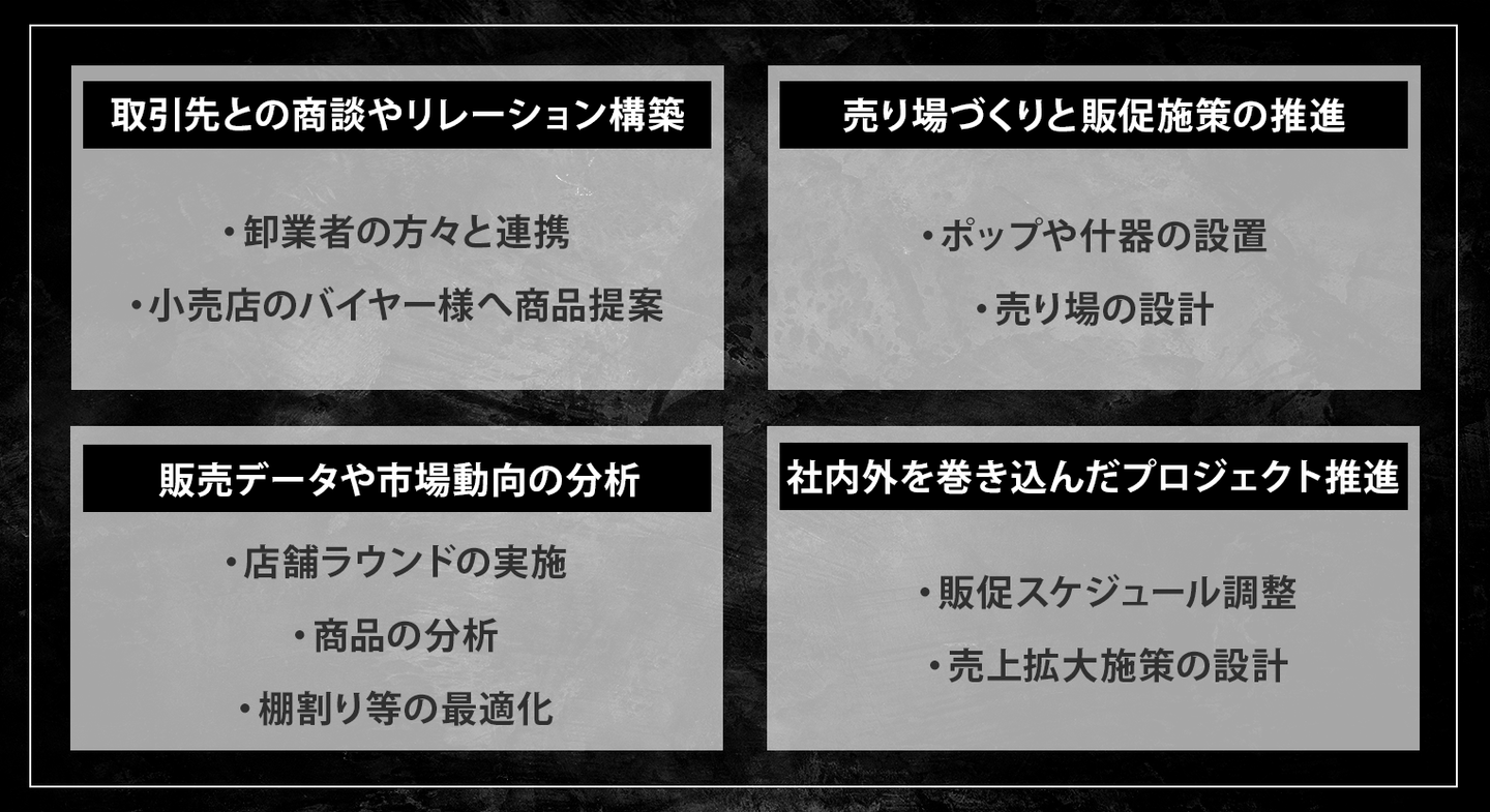 まず1つ目は、「取引先との商談やリレーション構築」。卸業者の方々と連携しながら、小売店のバイヤー様に向けて商品の提案を行います。