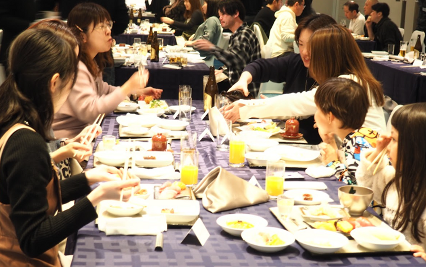 華やかな女子会のテーブルにもお邪魔させていただきました!長く勤務している大ベテランメンバーや、産休明けで復帰したメンバーなど、さまざまです。「吉銘は楽しいですか?」の問いに対して「どんどん居心地がよくなってきました!」と正直に答えてくれました(笑)。ちなみに、吉銘は、産休復帰率は高いです。