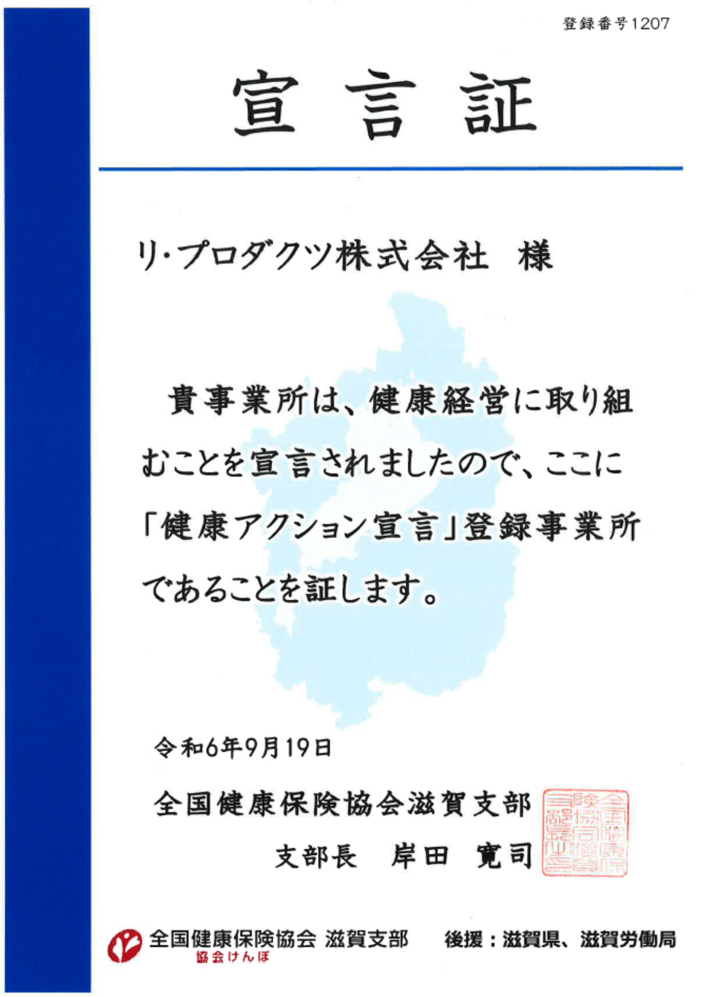 当社は、2024年からの取り組みで全国健康保険協会 滋賀支部の「健康アクション宣言」にエントリーしております。