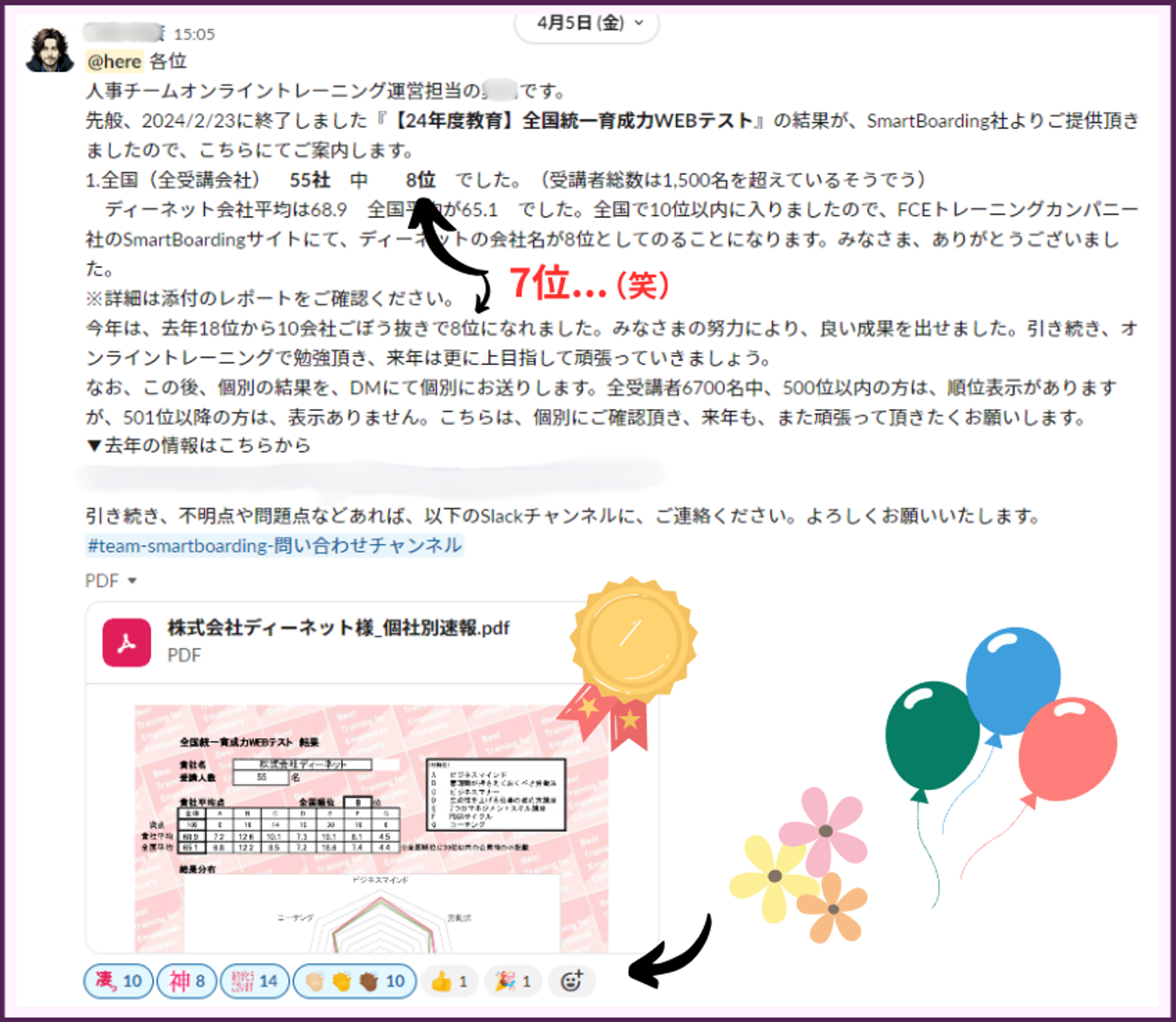 ※上の画像のように、テスト結果等はスラックにて社内全体に通知されます♪(順位間違ってるけど..笑)