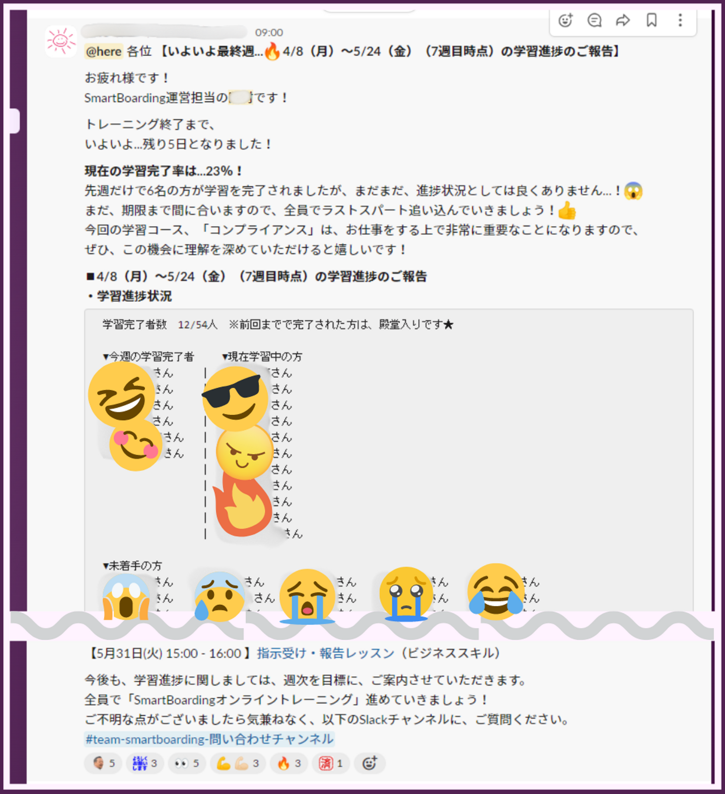 ※上の画像のように、毎週月曜日に全社員向けにに学習状況を周知しています。