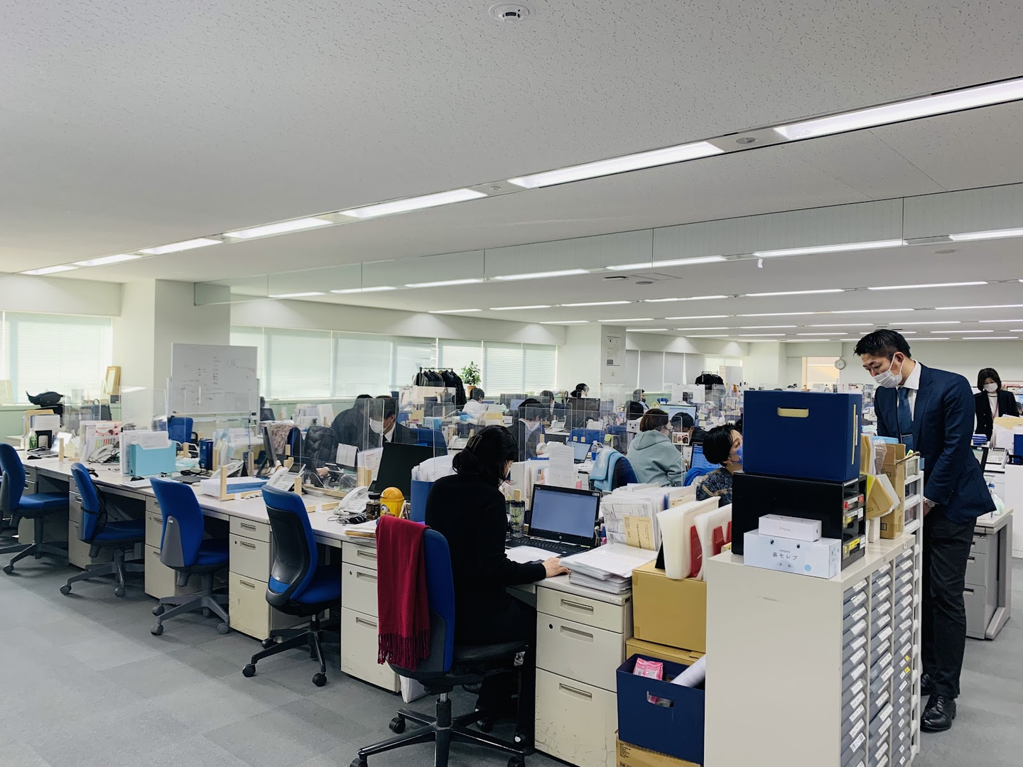 お客様向けに保険についての案内を用意していたり、ちょっとした会議をするフリースペースがあったり、、、明るくて温かみのあるエントランスです。