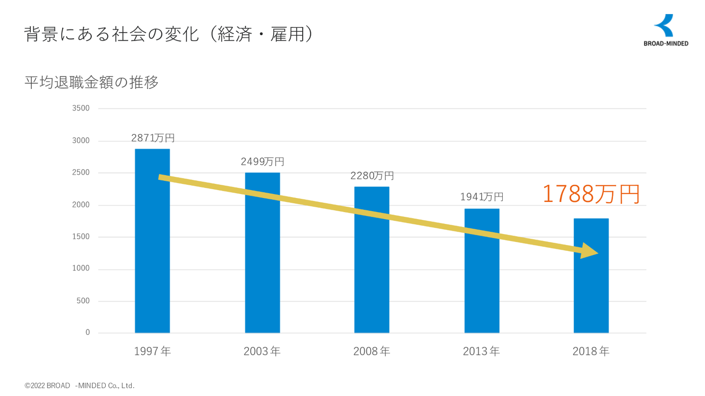 また、先ほど「昔、退職金は数千万円もらえていた」とご説明しましたが、今の平均退職金額はだんだん右肩下がりに減ってきています。