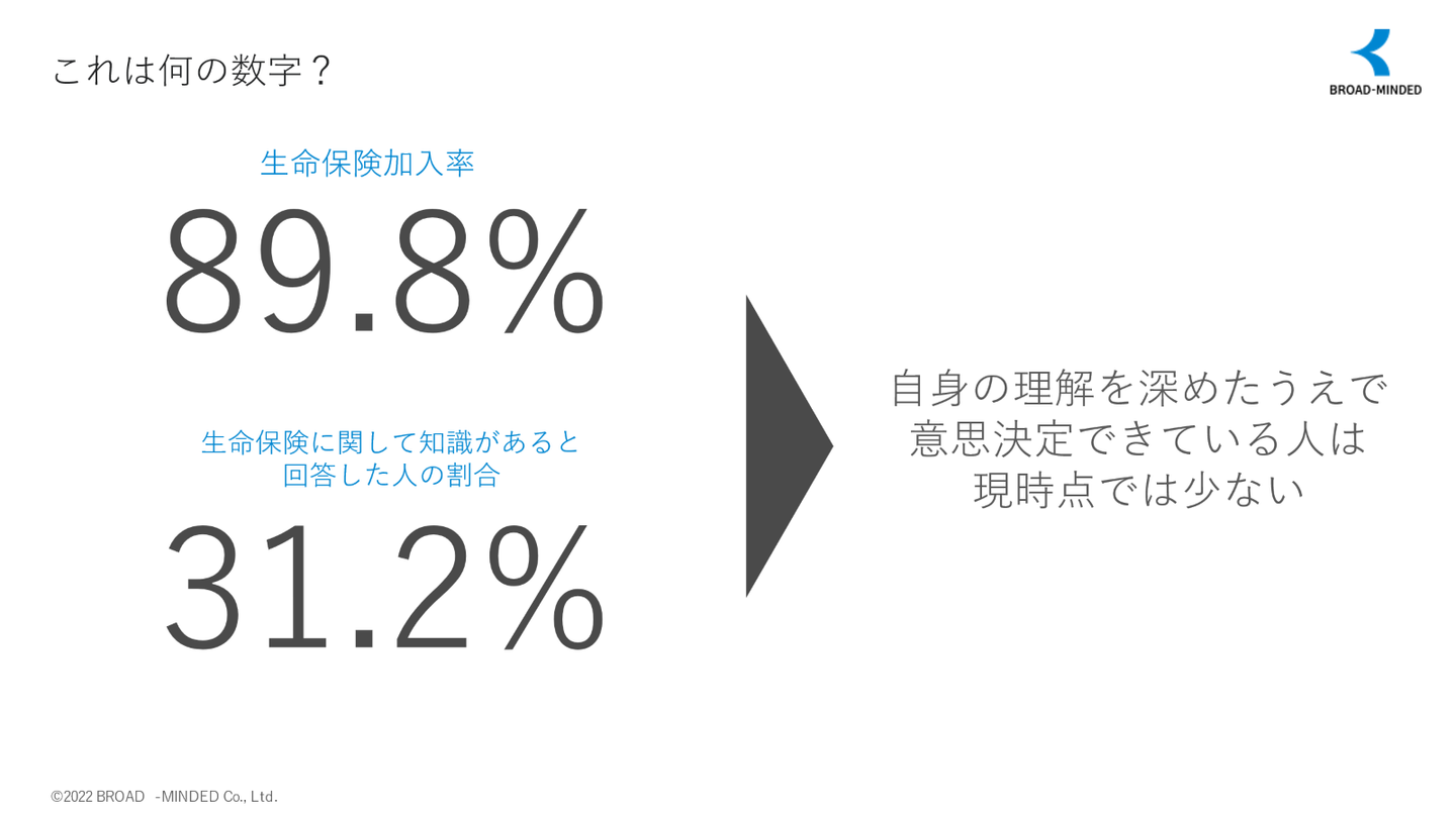 こちらは、国民の9割は生命保険に加入していて、そのうちの3割は加入した保険の内容を把握しているという回答結果です。裏を返せば、7割の方は保険の内容を把握していないということになります。