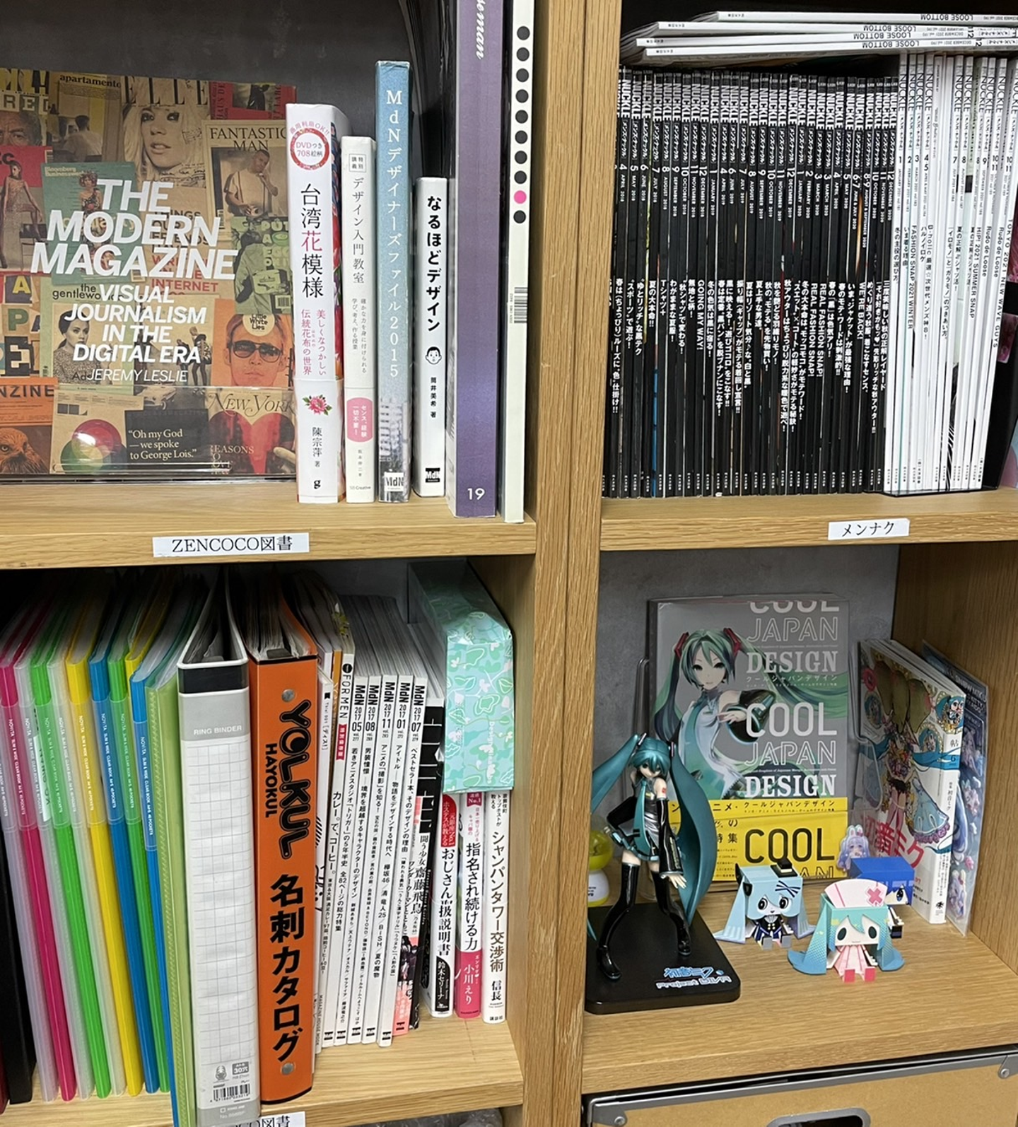 デザインの本からファッション雑誌、個人的な趣味のフィギュアまでいろいろ置いてます。