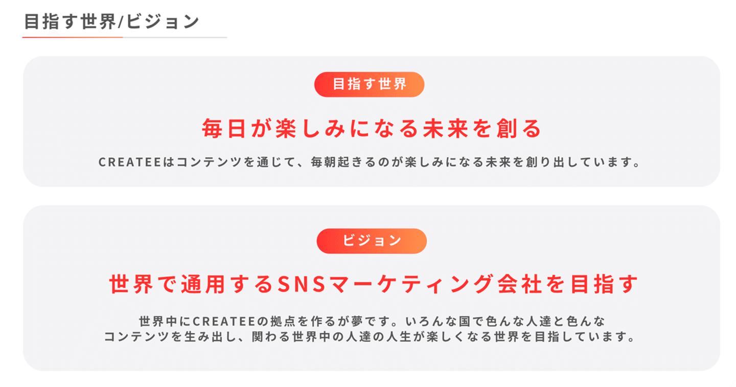 ありがたいことに、CREATEEに関わってくれるメンバーが20人〜30人程になってきました。関わるメンバーが多くなるにつれて「何を基準に行動したらいいか」「そもそも何をやっていてどこを目指しているのか?」が分からないという声があり、改めて会社が将来進んでいく方向や大切にしている価値観を言語化しようと思い今回に至りました。