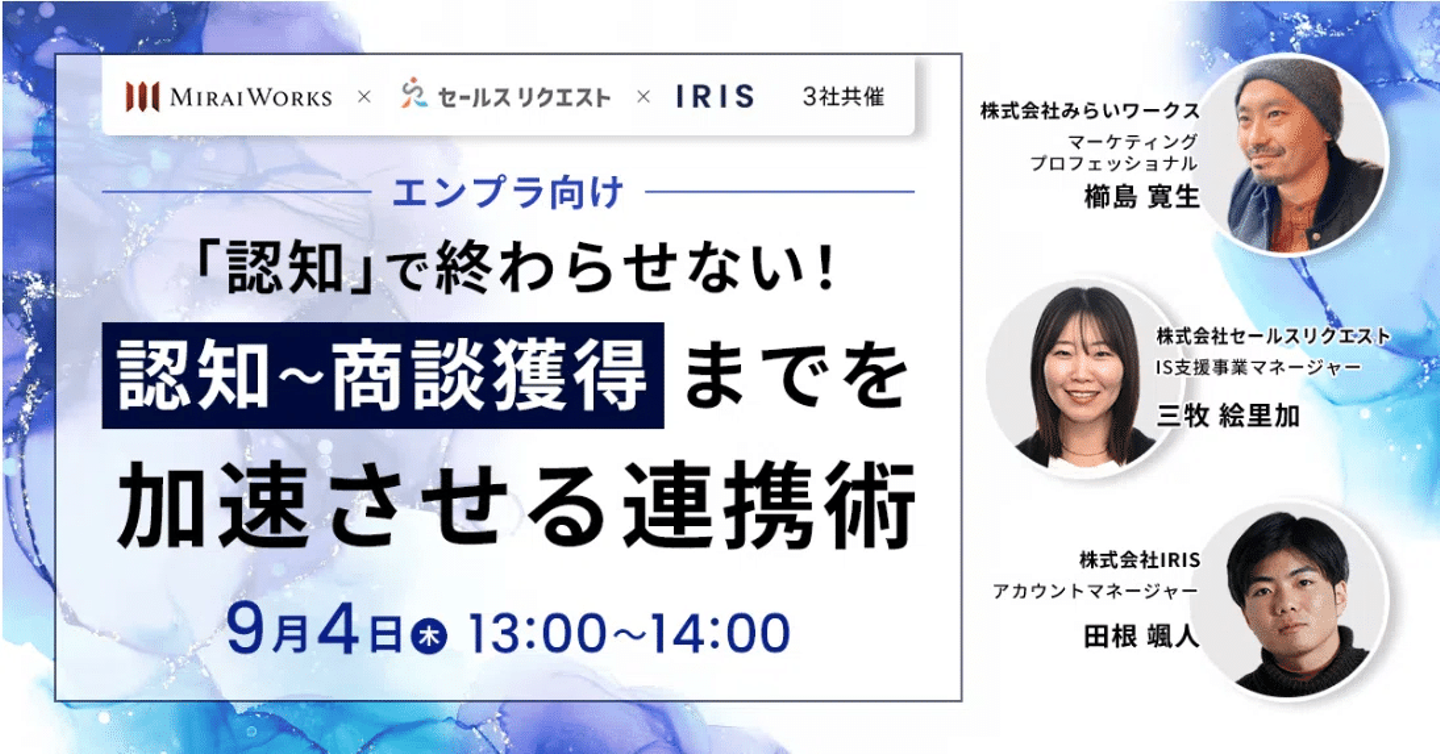 株式会社IRISの田根様、マーケティングプロフェッショナルの櫛島様と専門性を結集、エンタープライズ企業の役職者の皆様へ「成果直結型」のマーケティング・営業連携の方法をお話いたしました。
