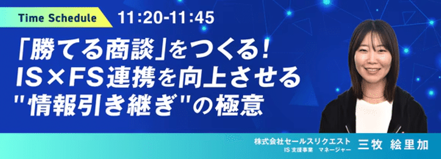 弊社からは「勝てる商談」をつくる! IS×FS連携を向上させる"情報引き継ぎ"の極意と題し、IS×FS間の引き継ぎ基準を再整理しながら、検討度・情報量・期待値をどう見立てて渡すか、どこまで事前に温めるべきか、そして共有フォーマットやコミュニケーションリズムの組み立て方まで、商談の精度を一段引き上げる具体策を紹介します。