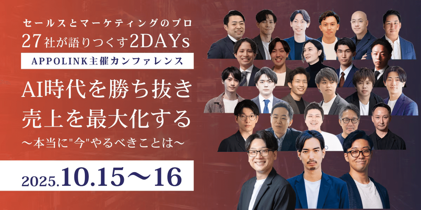 2025年10月15日(水)・16日(木)、APPOLINK様主催のカンファレンスのDay2の「セールス」セッション、 12:40~13:20の時間帯で、弊社代表取締役の原が株式会社UPDATA代表取締役の岡村氏と登壇いたします!