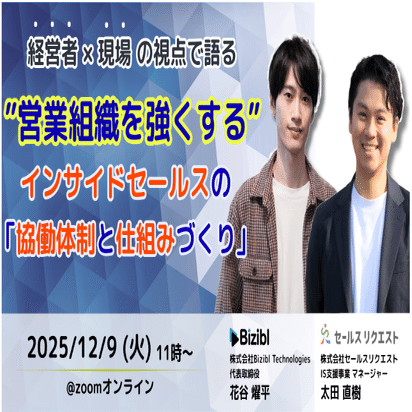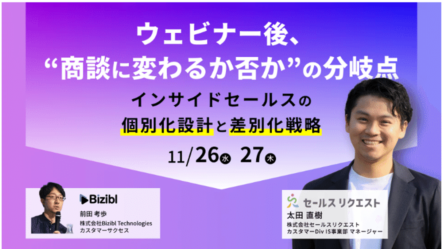 弊社の太田が登壇した株式会社Bizibl Technologiesさま主催「9月のインサイドセールス×ウェビナー強化月間」との連動企画が、ご好評につき11月26・27日に再放送されました。