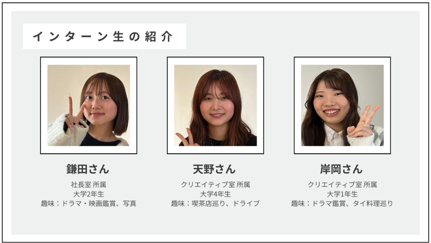 天野: 私は入社した時がコロナ禍でずっとリモートで、これがインターンなのかなと思っていたんです。だからこそ、こうして社員の方や他のインターン生と関わることができるようになって、みんなで協力しながら作業の進行ができるようになったことが、私も素直に嬉しいです !