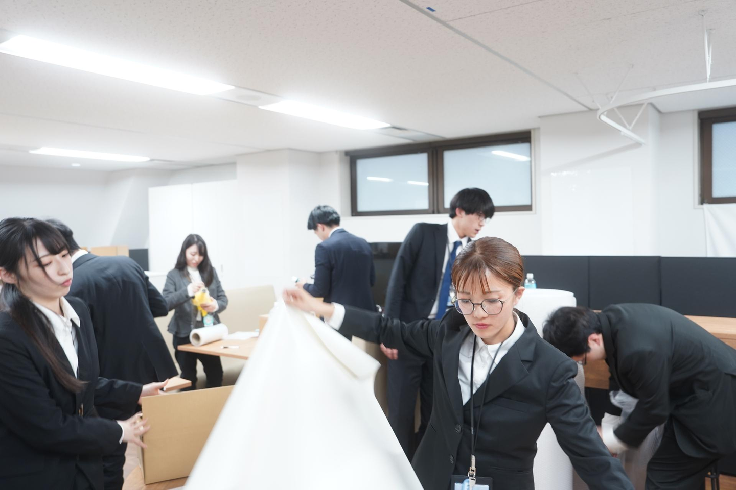 入社初日の夕方は、ダイアログ新入社員にとって入社式と並ぶ目玉イベント、梱包選手権を開催