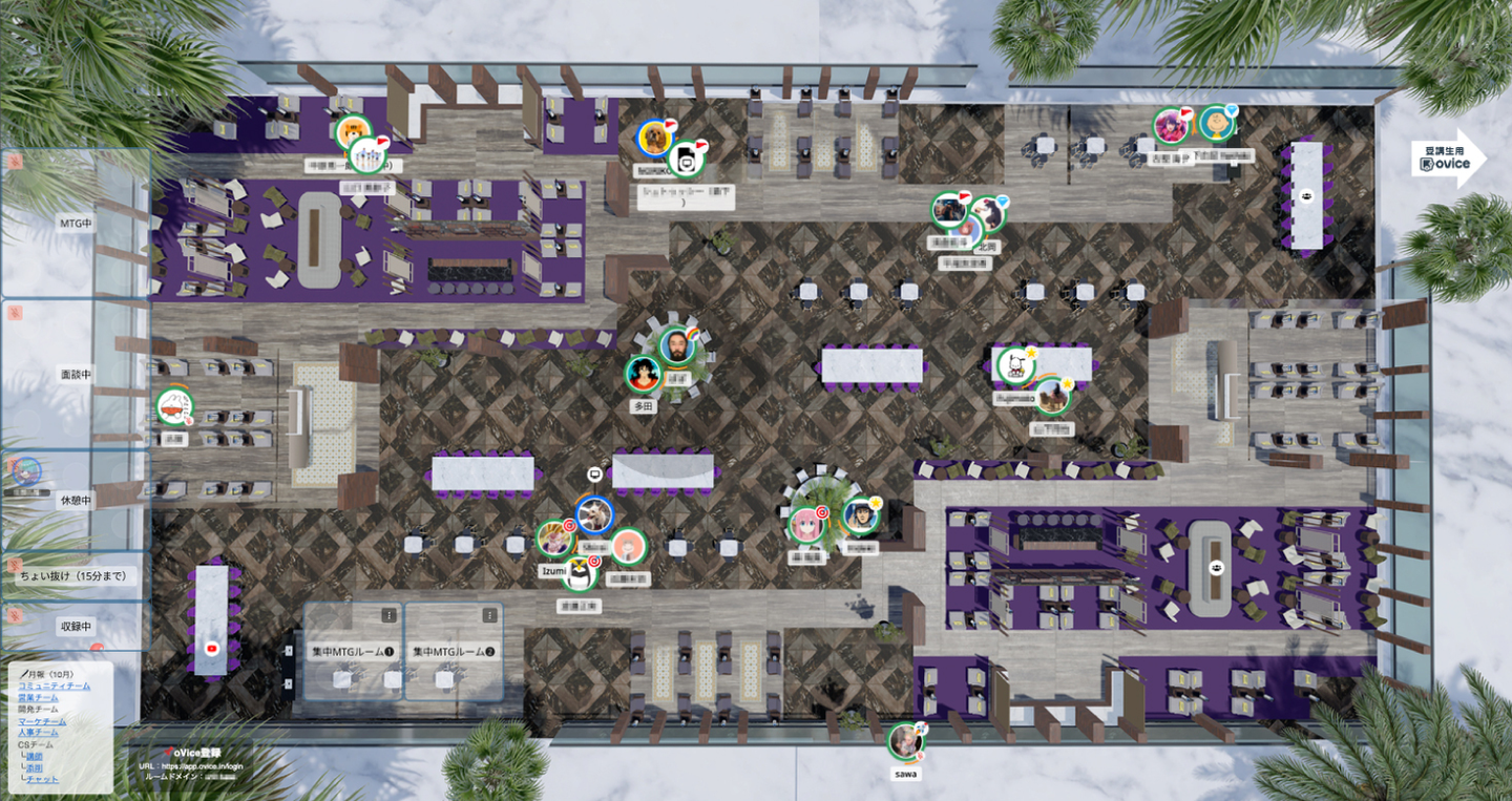 稼働している間は、バーチャルオフィスの『oVice』というツールにログインしてチームメンバーで集まって、チャット対応について相談したり、時には雑談したりしながら仕事をしています。