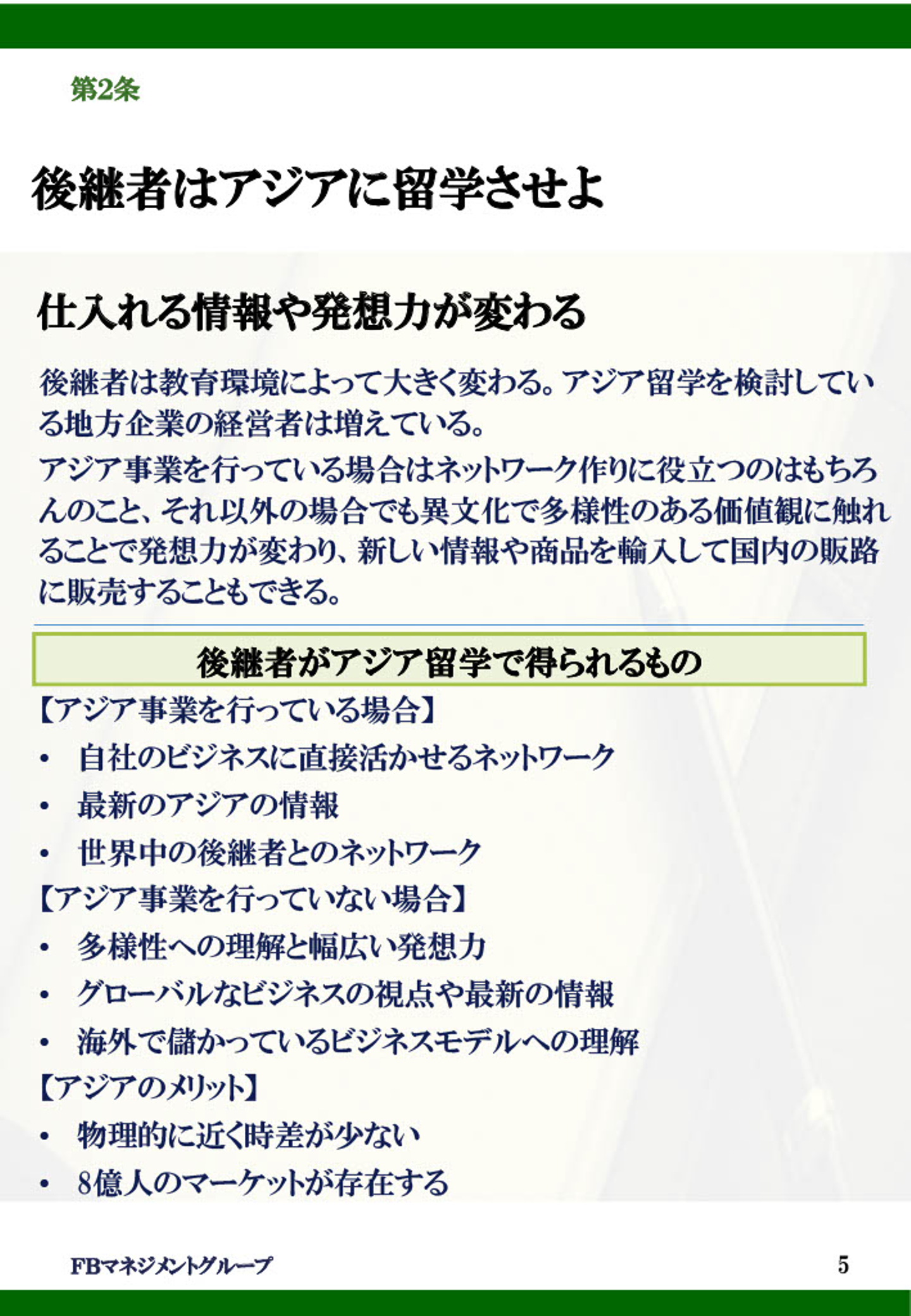 既にアジアで海外事業を行っている場合は、最新のアジア情報に触れる事ができ、リアルタイムで経営者である家族に報告を入れられる環境に置かれる事で、家業への興味が沸いたり、在学中から事業へ貢献する等も期待できるかもしれません。