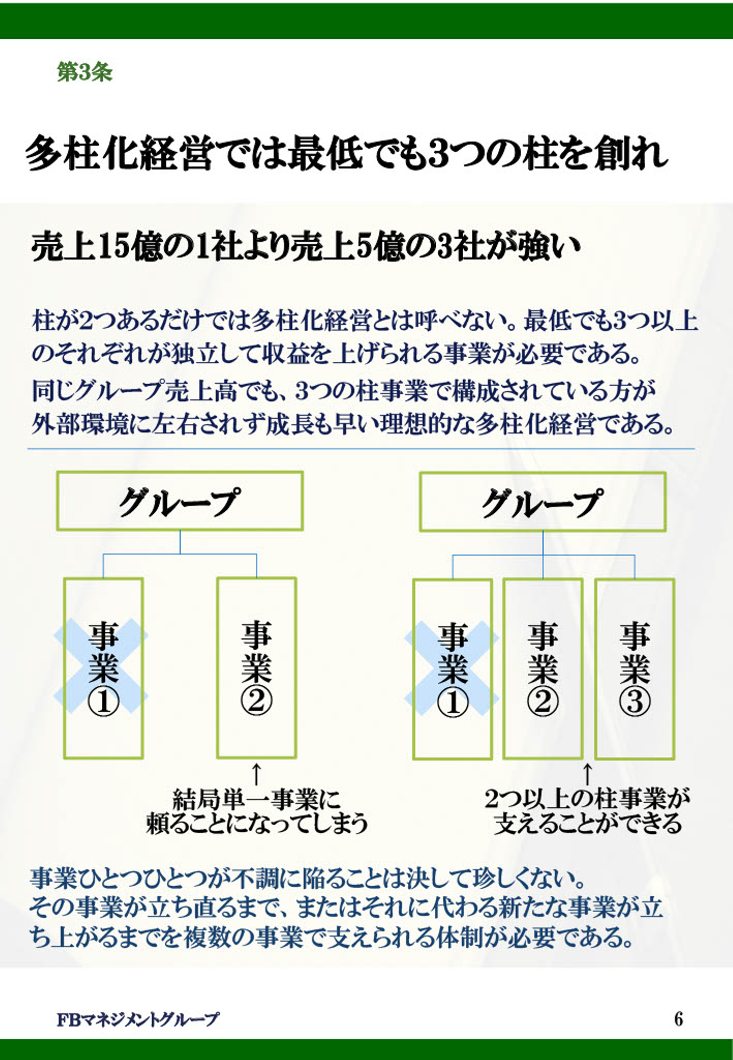 理由としては、冒頭で触れた通り「外部環境の変化」に最低限耐えうる事業数という意味では「安定して利益を生み出せる事業が2つ」と、最短スピードで事業を成長させられる事業数という意味で「今後の収益化を見越して育てる事業が1つ」で、最低限【3つ】の事業を持つことが【多柱化経営】にとっては重要なポイントとなります。
