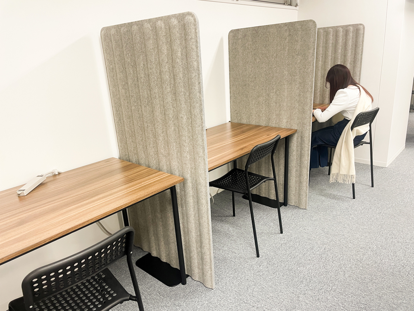 また壁に向かって机と椅子、パーティションで仕切られたスペースは「集中ブース」。自分の業務に黙々と全集中できるということです!