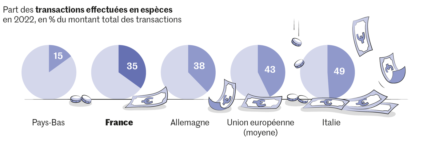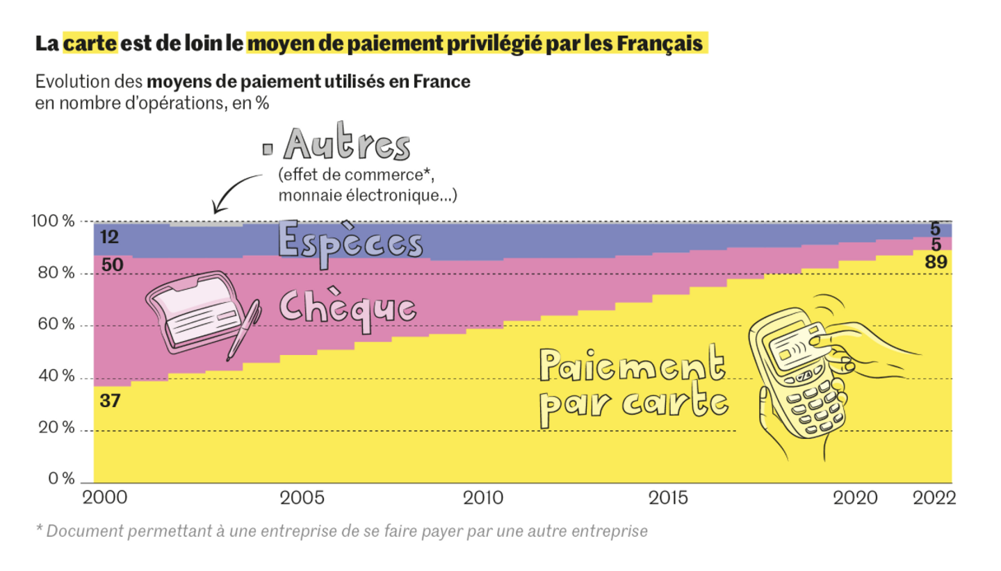 パリ発行の新聞『Le Monde』によると、欧州中央銀行の2022年調査では、フランスの取引総額に占めるカード支払いは53%、現金が35%、モバイルアプリケーションが3%を占めています。