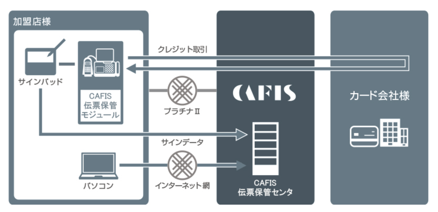 「CAFIS伝票保管サービス」は、これまで紙伝票で行ってきたクレジット決済の署名などの代わりに、サインパッド上で取得した電子サインを利用することで、サイン伝票の紙出力を廃止するものです。