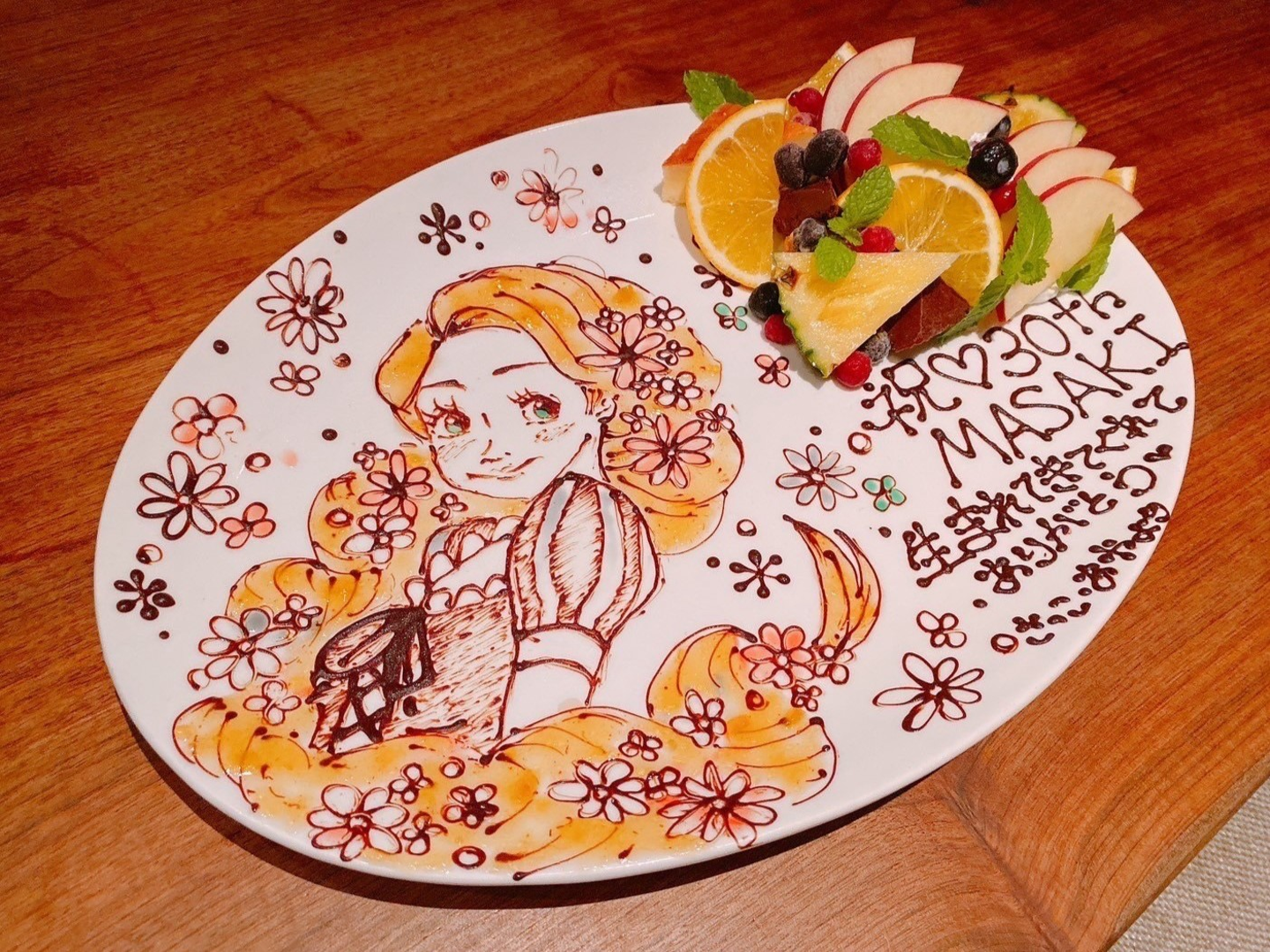 私が入社した頃は、基本プレートはキッチンの方にお願いしており、ホールの方が描いたりすることはなかったようですが、前職のイラストケーキの経験を活かして、アニバーサリープレートを描くようになりました。自分の描いたプレートで、お客様が笑顔になる瞬間を見て、どんどん楽しいと感じるようになりました。