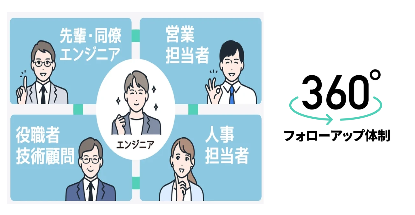 神崎:本制度は、当社で働くエンジニアに対し、成長できるベストな環境を一緒に考えたり、スキルアップにつながる提案を多方面から行うことを目的としています。背景には、SESという形態上、どうしてもエンジニアと会社との距離が生まれやすく、十分なフォローをしづらい状況がありました。そこで、エンジニアの働き方やスキルアップに関する困りごとを即座にキャッチし、必要な対応を行っていくための取り組みとして「360度フォローアップ体制」を構築するに至りました。