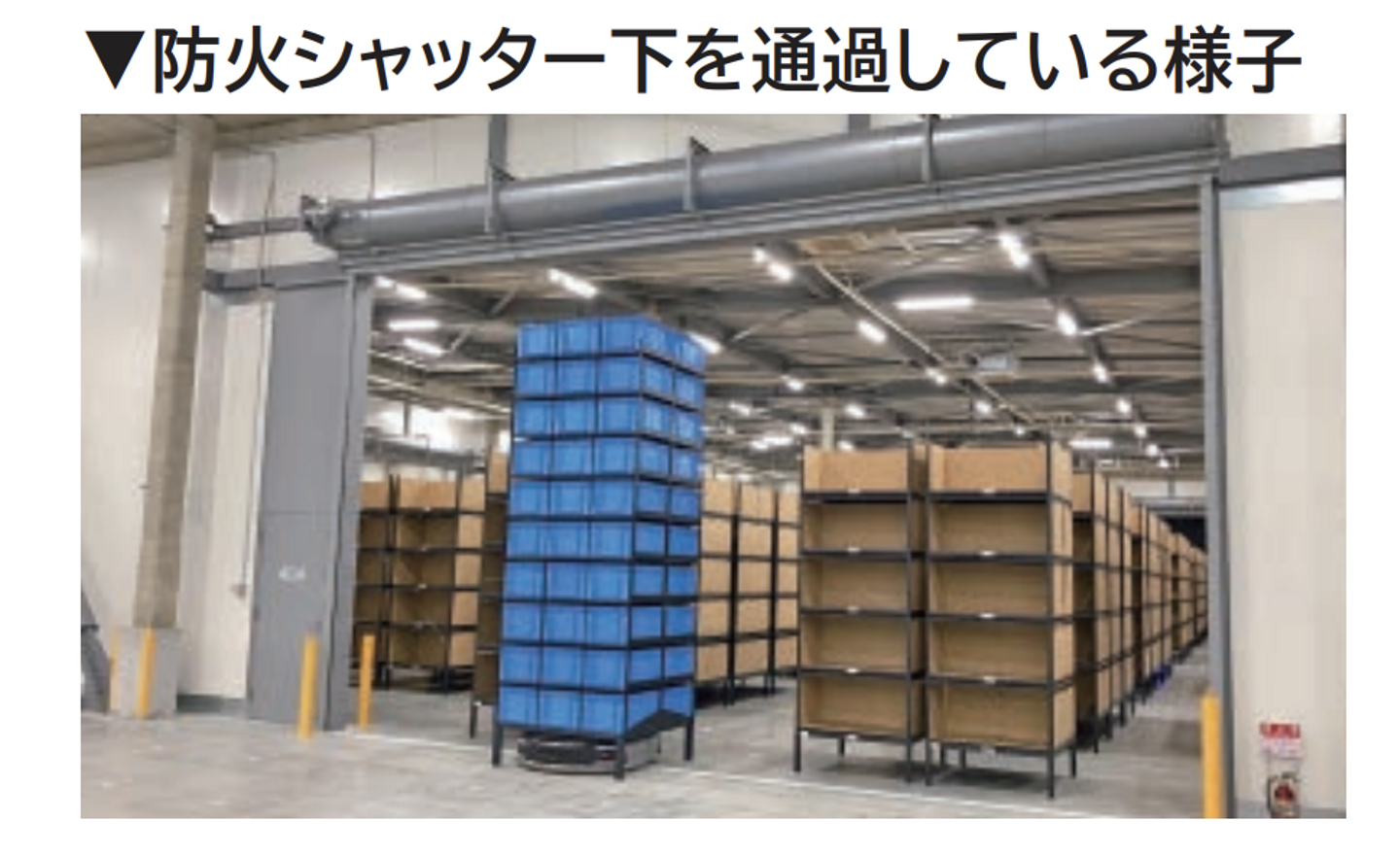 - 注記:(1)国内の倉庫は、建築基準法に従い、倉庫内に500坪程度ごとに防火区画と呼ばれる区画を設置する必要があり、この区画を仕切る壁に、防火シャッターが設置されています。火災時にはこのシャッターが下がり、延焼を防ぐように設計されています。
