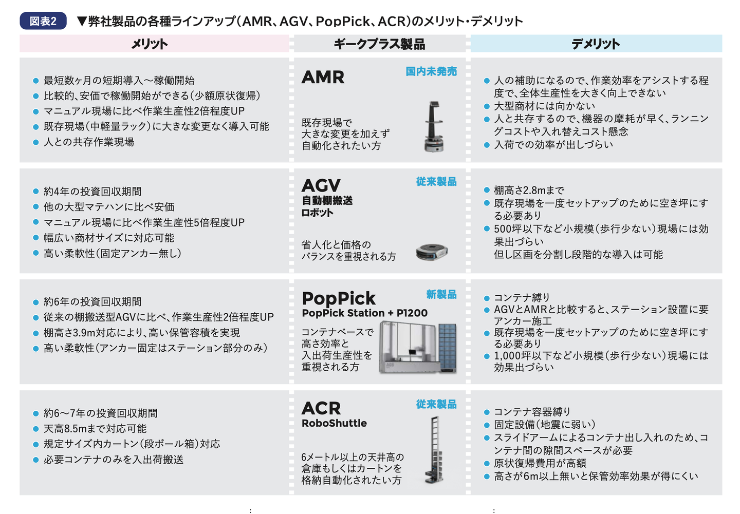弊社製品の各種ラインアップ(AMR、AGV、PopPick、RS)のメリット・デメリット