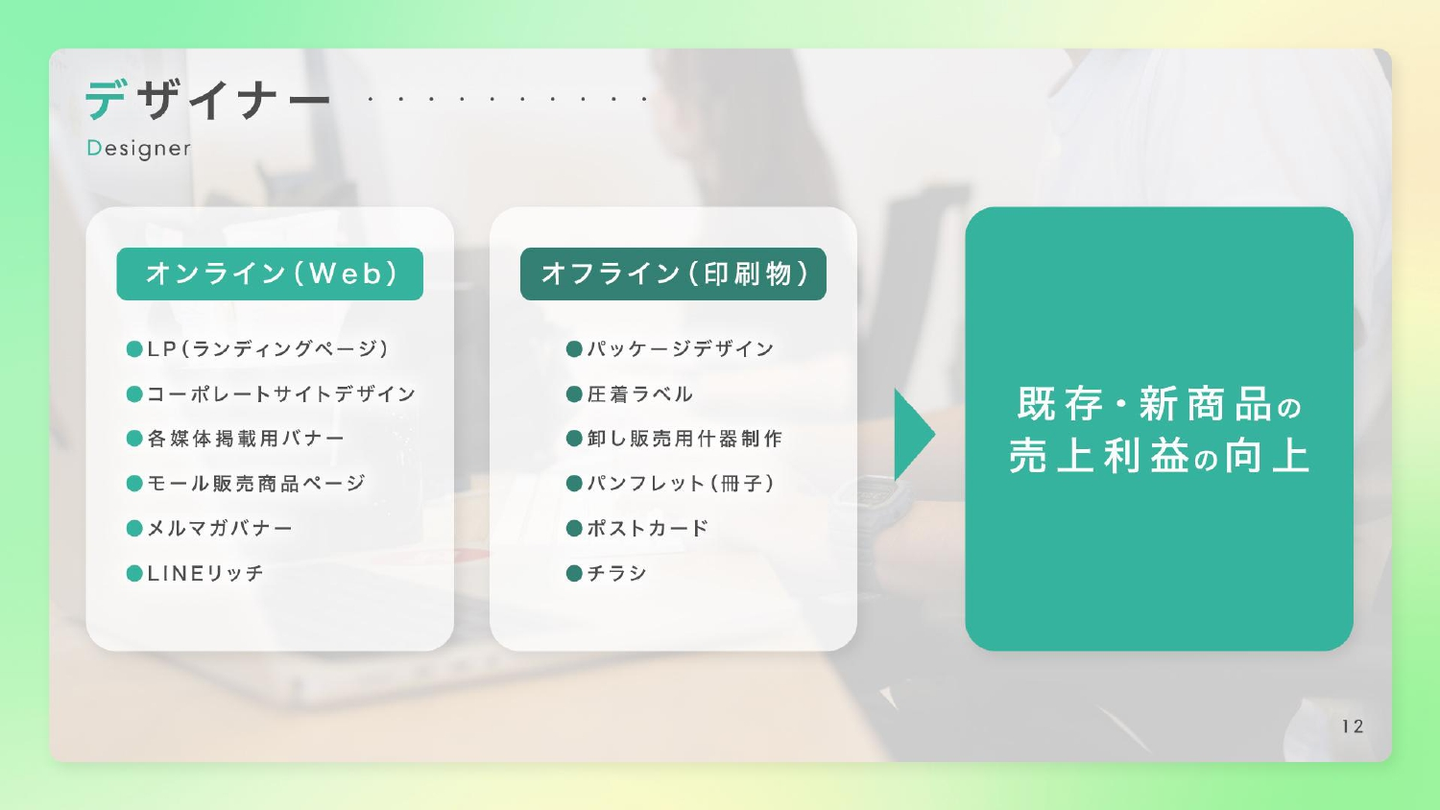 オンライン(WEB)だけでなくオフライン(紙媒体やプロダクト等)の制作物も存在し、広い範囲でデザインを制作できるのが特徴です。