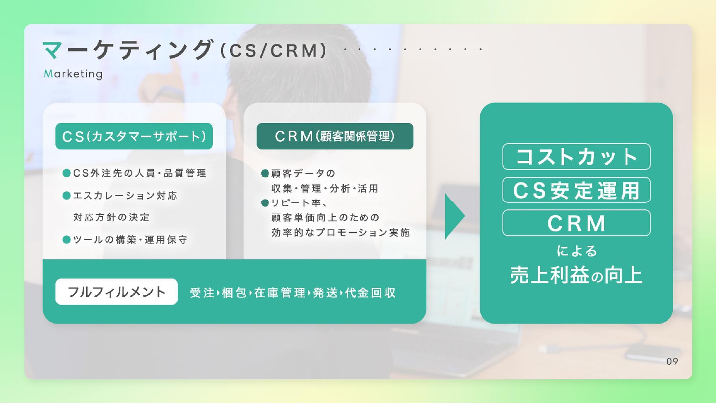 CRMは、リピート率の向上や顧客単価向上のための施策を通じて、売上を最大化するポジション。自社商品をより長く、より多く使用いただく仕組み作りを行います。