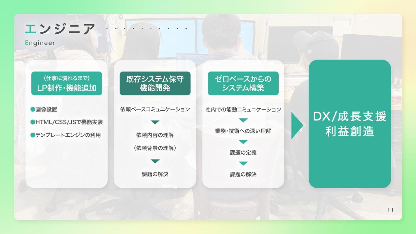 エンジニアは、ECサイトの運用・保守やシステムの作成・保守などを通じて、会社を支えるポジション。TopEyesのエンジニアはWeb系エンジニアです。