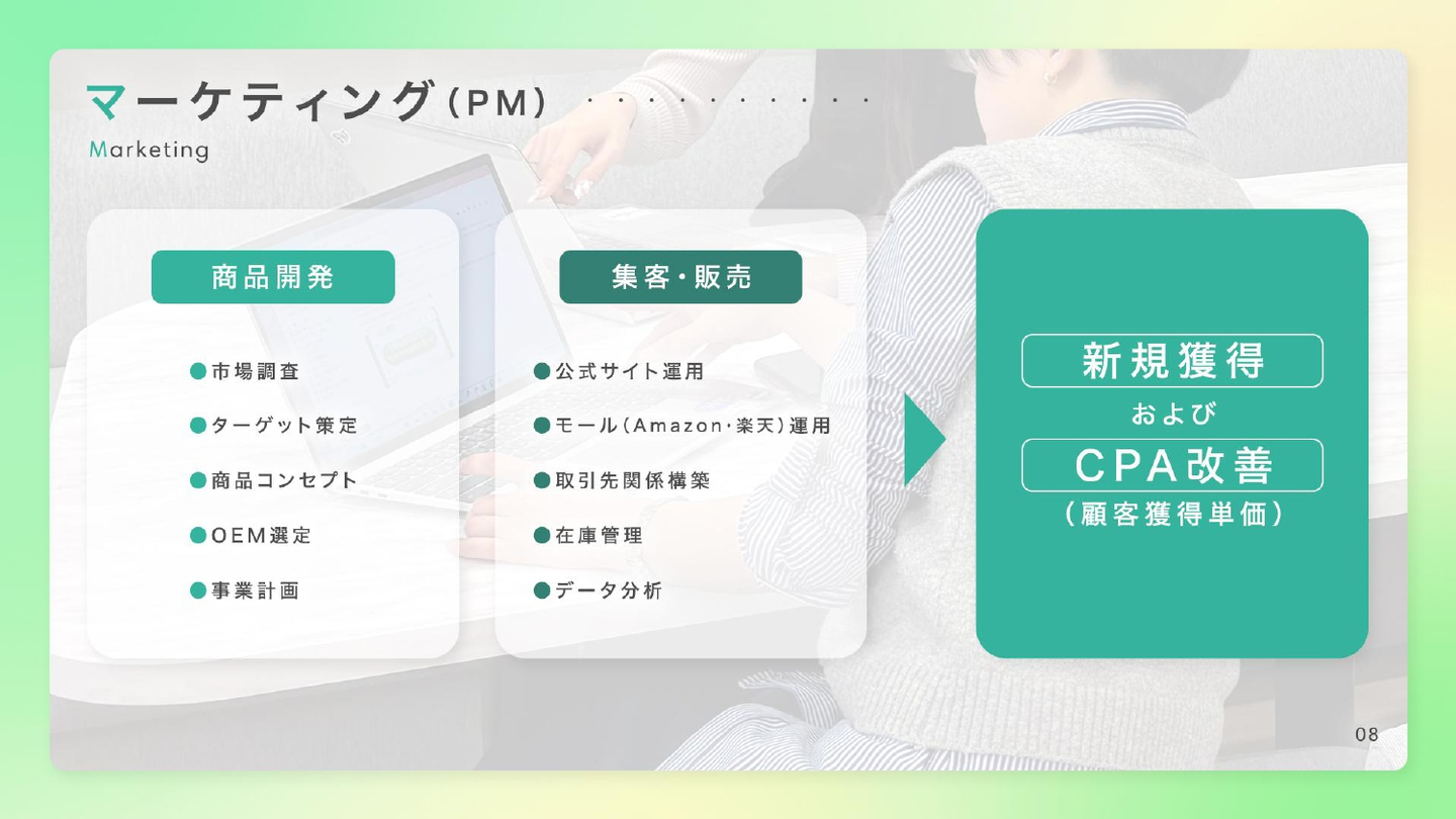 商品企画から販売、数値改善を行うポジション。自由に発想し、自分のアイデアで新商品を生み出せるのが、マーケティングポジションの醍醐味です。