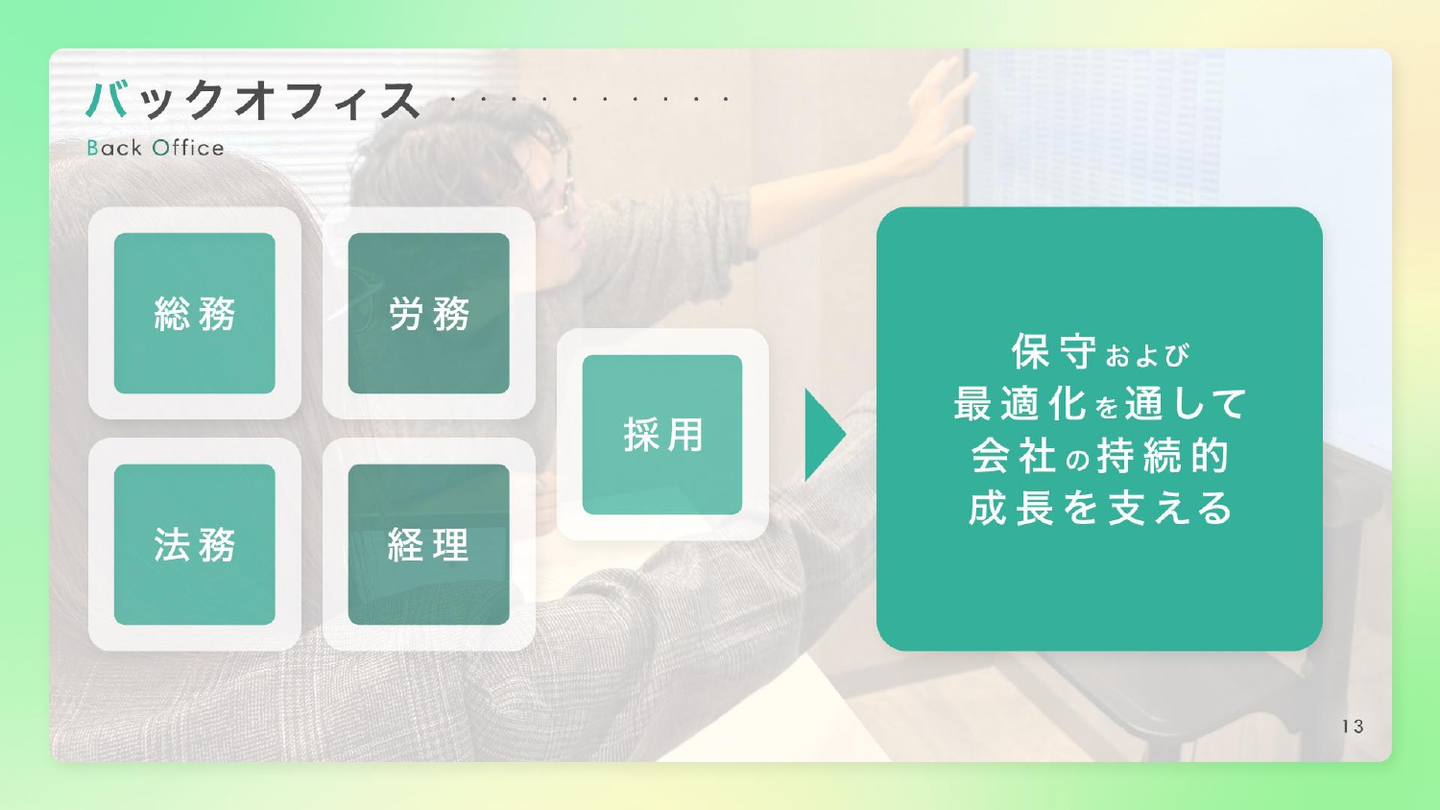バックオフィスは、会社全般の業務を裏側から支えるポジション。メンバーそれぞれの得意領域に合わせて、役割分担をしています。