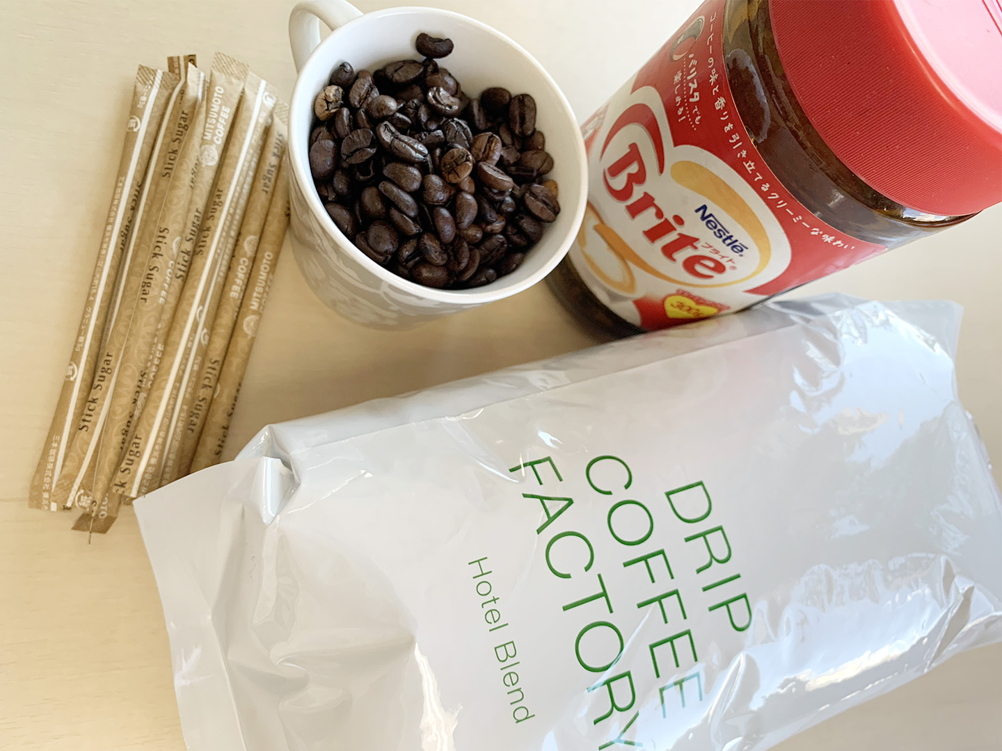 コーヒーメーカーの横にはスティックシュガなどが設置されています。お好みの甘さのコーヒーを飲みながら、仕事することができます。