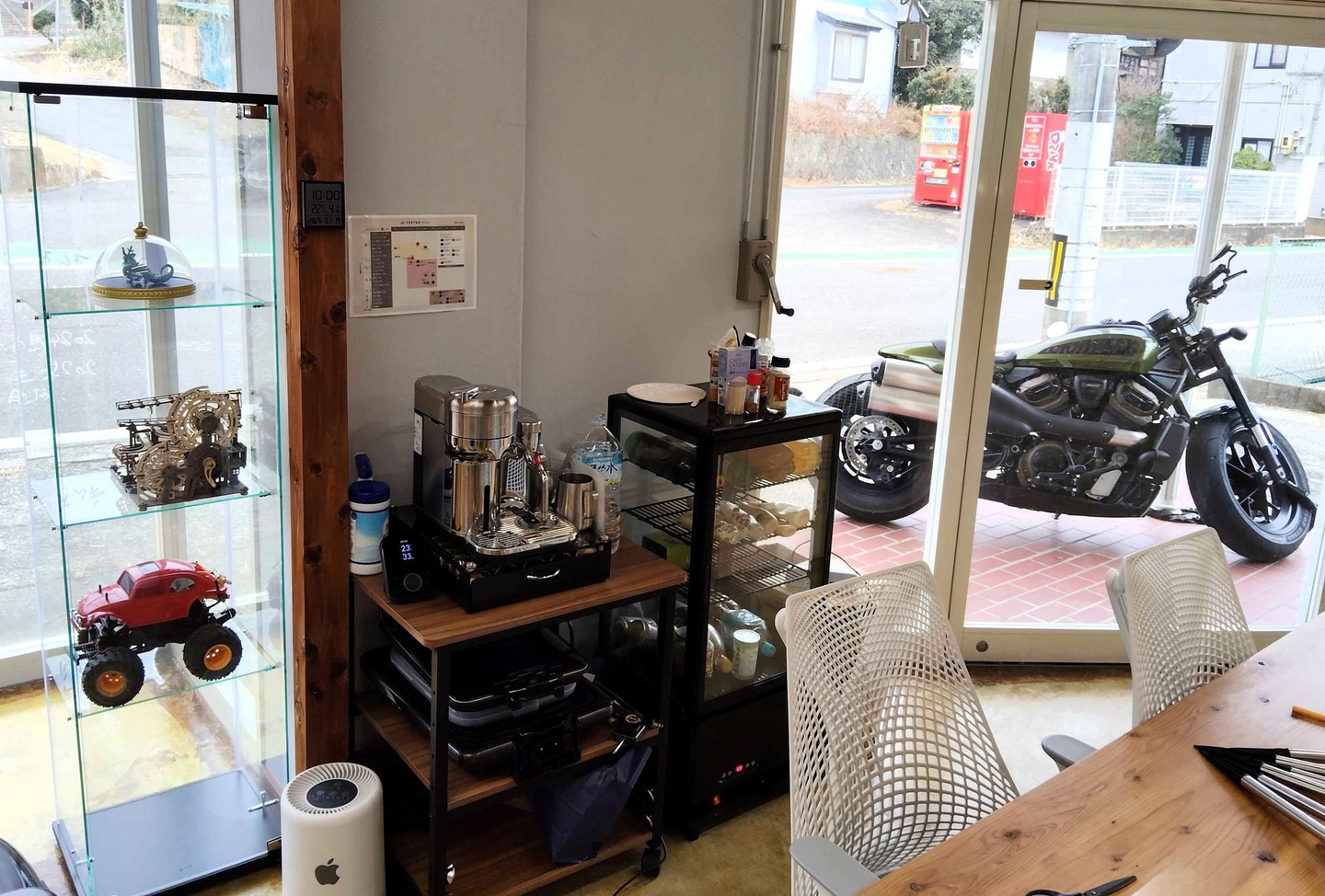 写真をよく見ると、コーヒーマシンの横にガラスケースが。