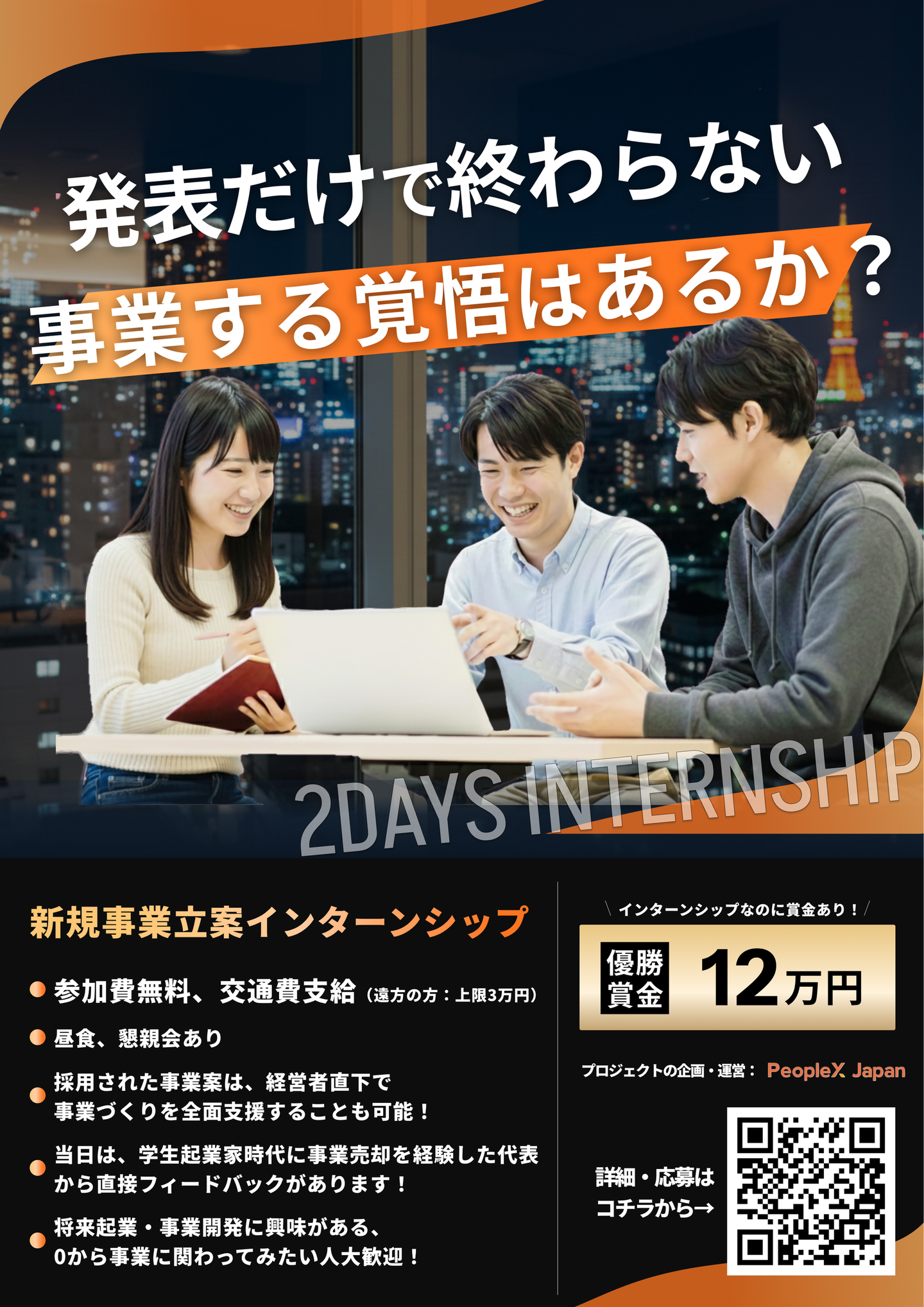 本企画は、現在私たちが注力している「新規事業立案」において、即戦力として活躍できるポテンシャルを持った若き才能と出会うための、実践型インターンシップです。