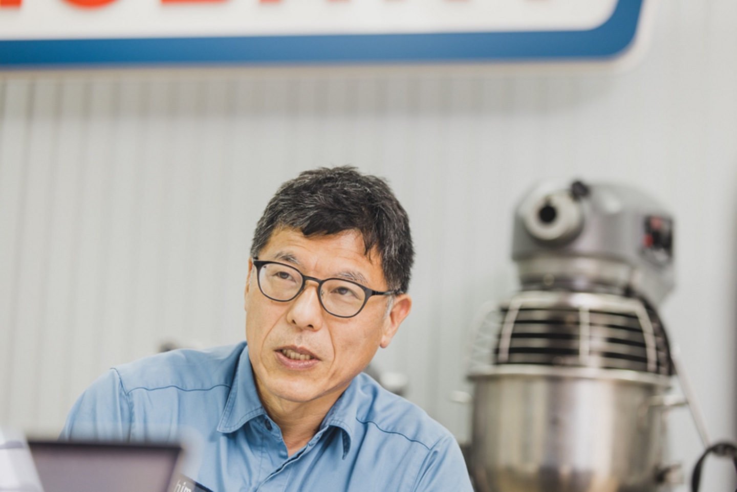 新村:僕は、以前はメーカーのサービスマンや潜水士の仕事などをしてきました。ここに入社する前は同じ厨房機器メーカーの競合会社に5年勤めていました。辞めた理由は仕事とプライベートのバランスが悪くなったことです。転職を決めて別の会社に移ろうとした寸前に、前職の同僚がホバート・ジャパンに勤めていて、彼から声をかけていただき入社が決まりました。今では入社して4年目です。