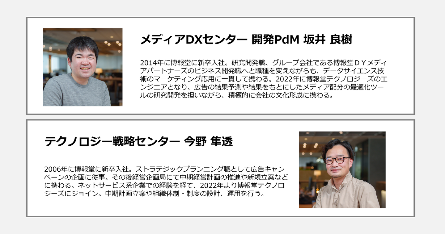 今回は博報堂テクノロジーズで中期計画の立案や組織制度の策定に携わる今野と、現場のエンジニアとして活躍しながら会社の文化形成に積極的に取り組む坂井の2人にインタビュー。これまで取り組んできた”会社作り”の裏側について語ってもらいました。