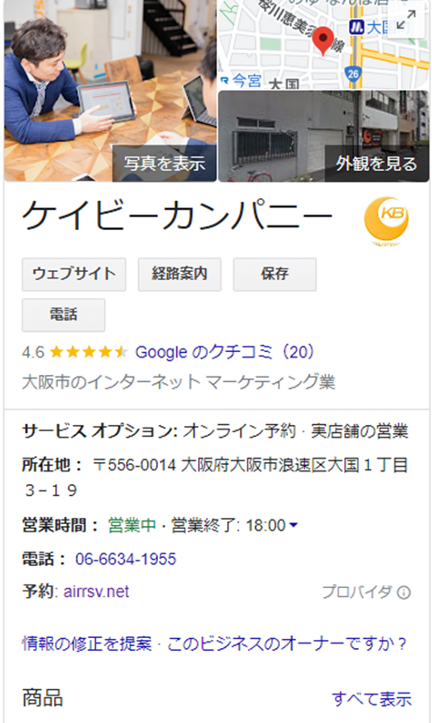 このGoogleビジネスプロフィールには、住所や電話番号など、お店や企業の基本的な情報が載っており、口コミや投稿の機能も付いています。