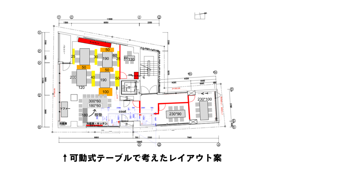 考えるのが一番大変でした!定期開催しているハッピーアワーでの使用も考えたときに、向かい合って座れる形が欲しいとなり可動式にしようというアイディアが出ました。それを両立できる形を具体化することに苦戦しました。レイアウト案は、20枚ほど出しましたね(笑)