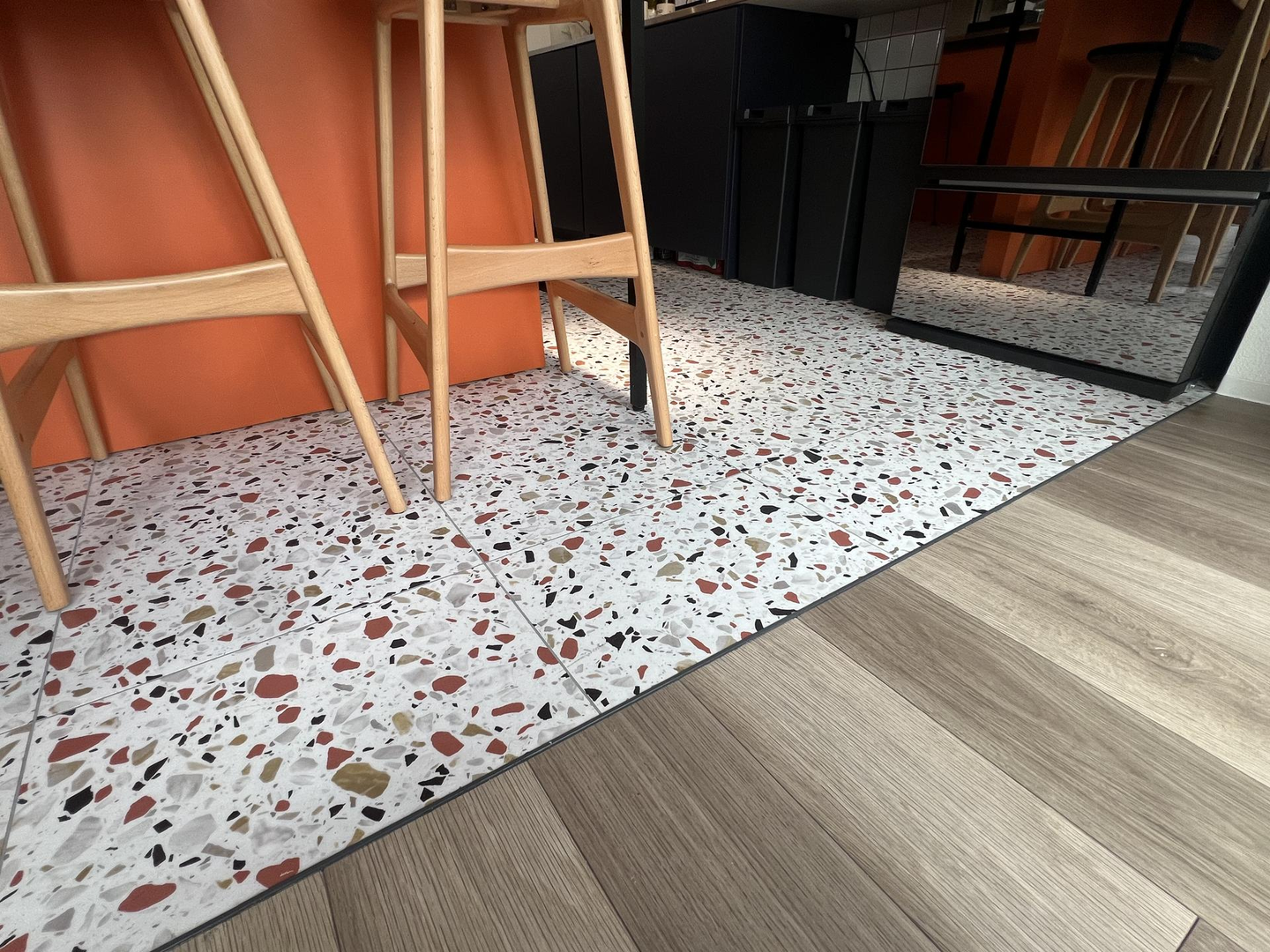 ↑ キッチンスペースの床、ハイテーブルの壁もオレンジを基調としたデザインに統一