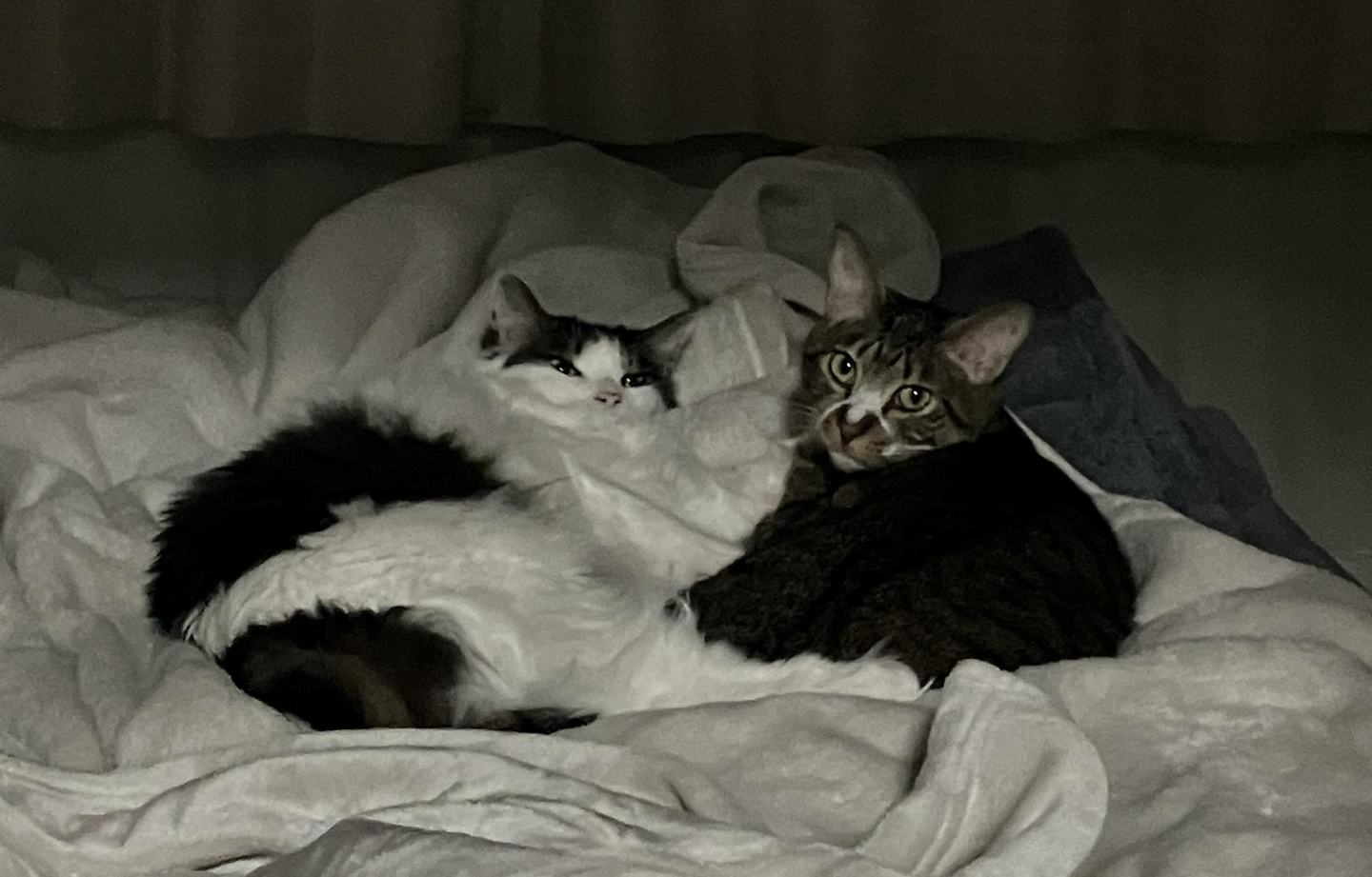 猫は2匹飼っていて、写真の左がオレオ(白黒猫)、右がビスコ(キジトラ猫)です。