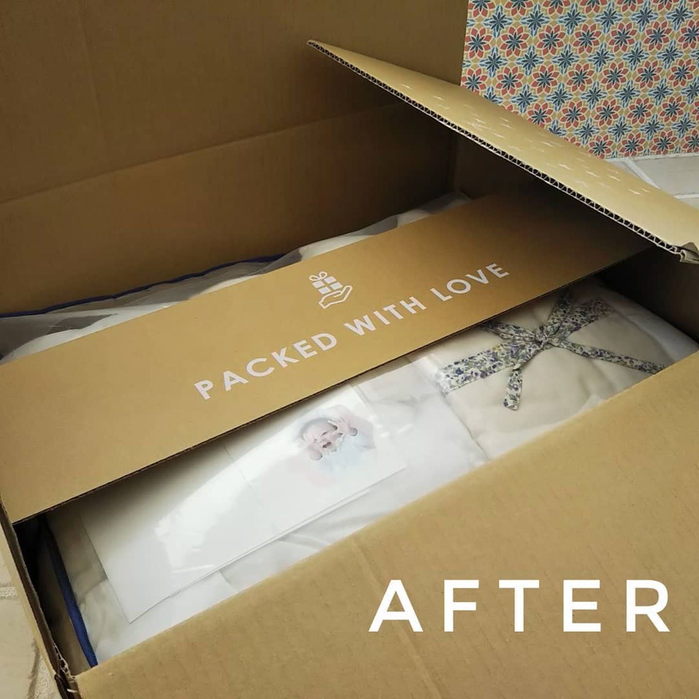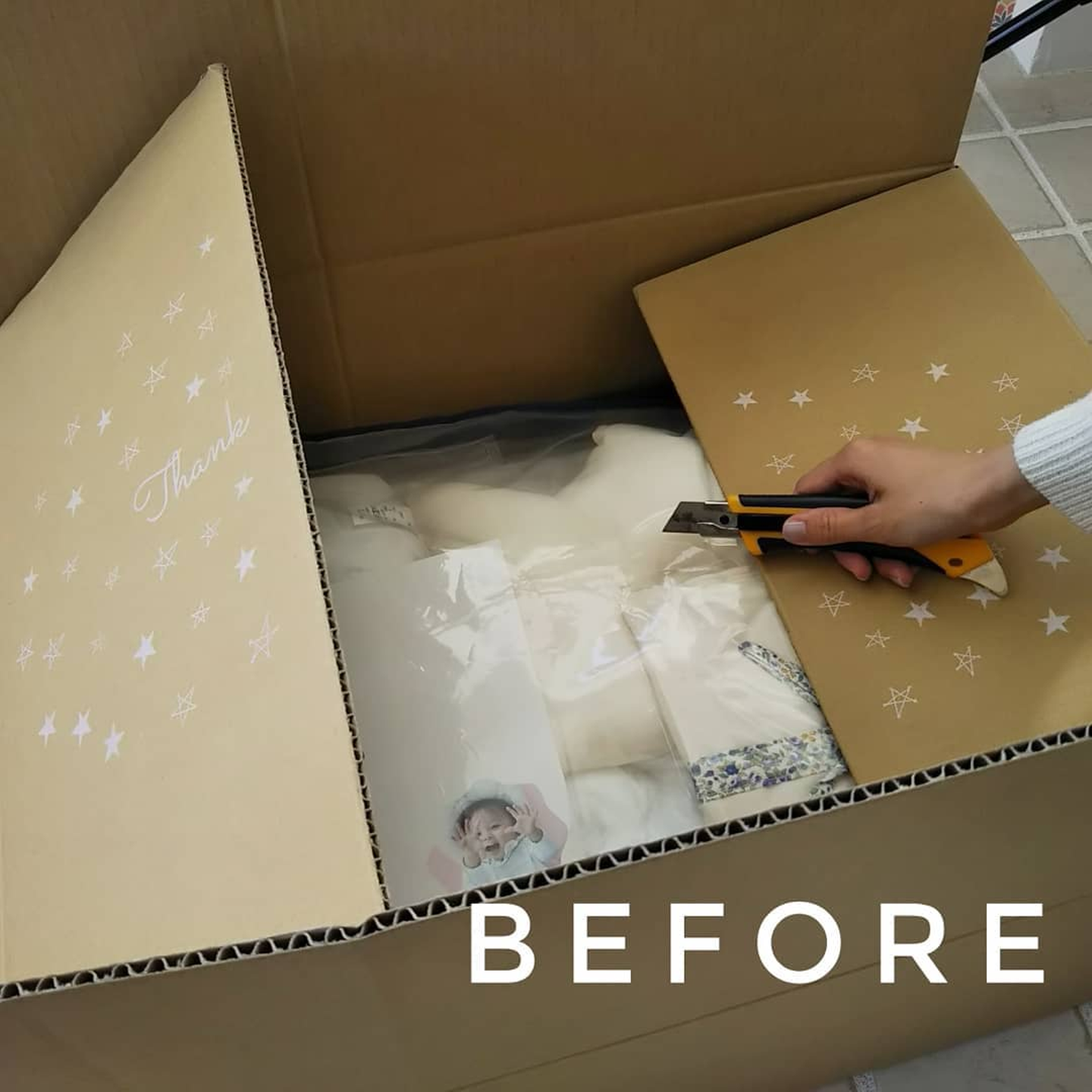 一枚ボードを入れることでカッターが直接当たらないようにしました。これで品物が傷つき心も傷つくという展開は防げそうです。開封の際には是非、このボードの存在に気付いていただけたら嬉しいです。