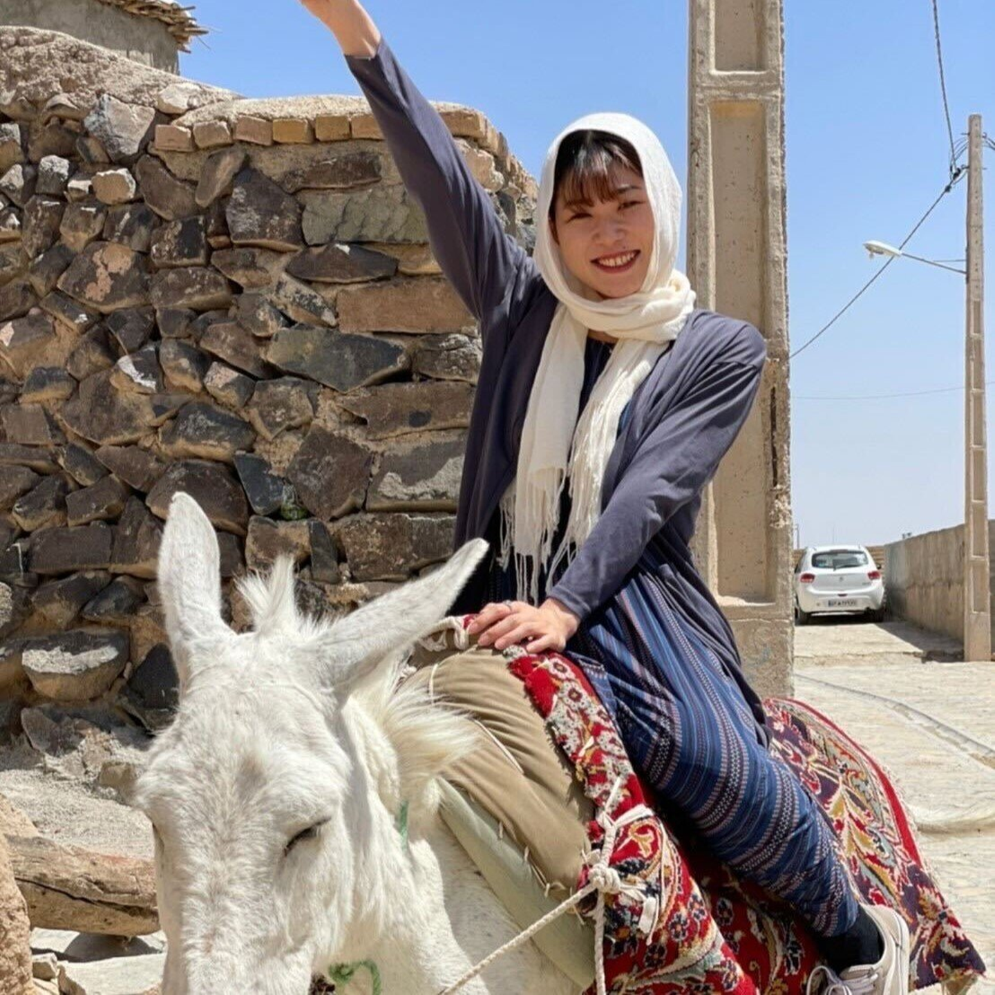 イランにて道端で出会ったロバに乗せてもらっているところです