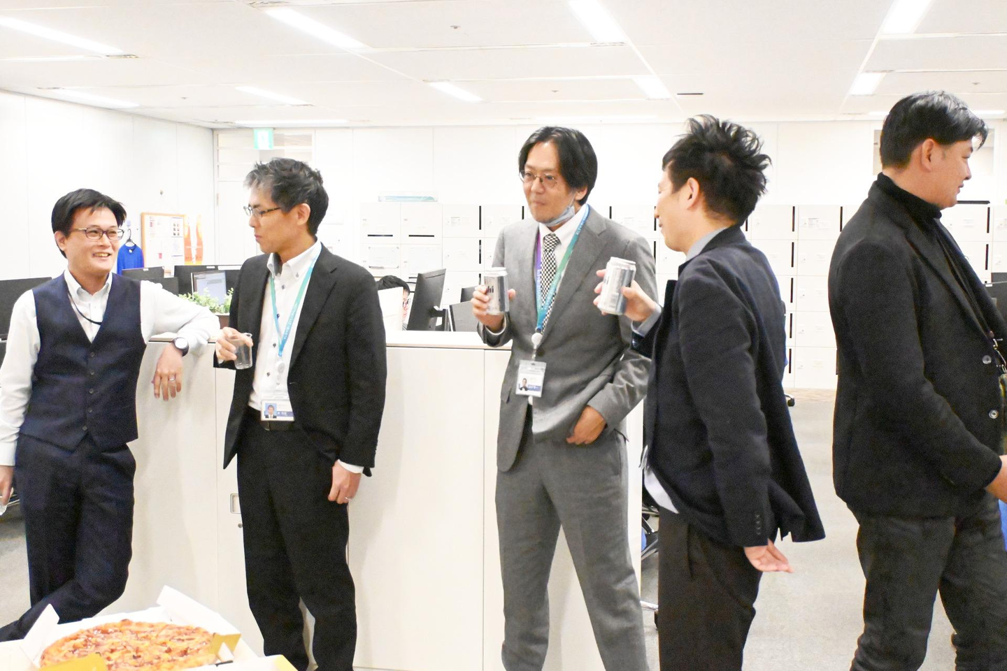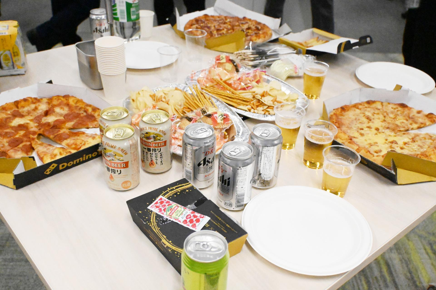 納会では社長や取締役からの講話などはなく、各自がビールなどを片手に雑談に興じていました。フードのメインはピザ。参加人数が増えたのでオーダーや酒類の担当者は大忙しでしたよ。